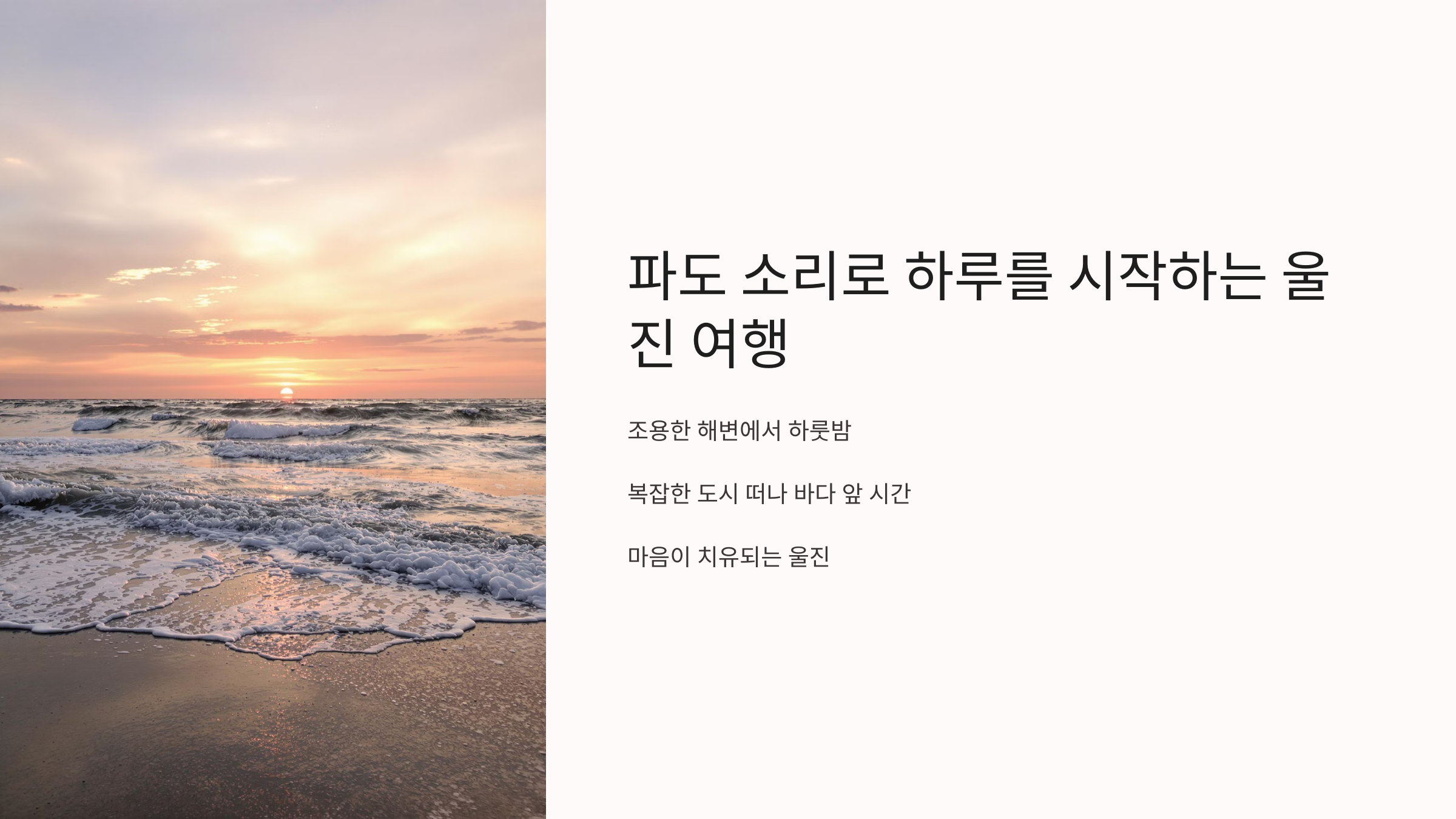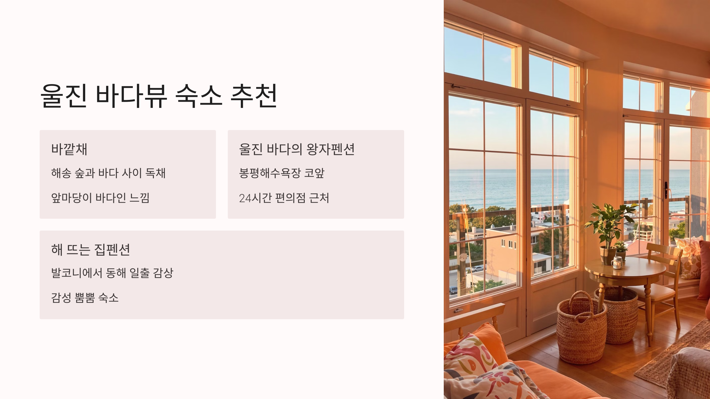 여러분, 조용한 해변에서 하룻밤 보내본 적 있으신가요? 저는 얼마 전 울진 여행을 다녀왔는데요. 복잡한 도시를 잠시 떠나 바다 앞에서의 시간을 보내는 것만으로도 마음이 정말 많이 치유되더라고요. 혼자 여행하기에도 좋고, 사랑하는 가족이나 친구와 함께라면 더할 나위 없겠죠. 울진에는 소박하지만 뷰 하나는 끝내주는 바다뷰 숙소들이 참 많아요. 오늘은 그중에서도 직접 가보고 추천하고 싶은 곳들, 그리고 근처에 있는 감성 맛집과 카페들까지 소개해볼게요. 진짜... 다음 여행지는 울진이어야 해요!