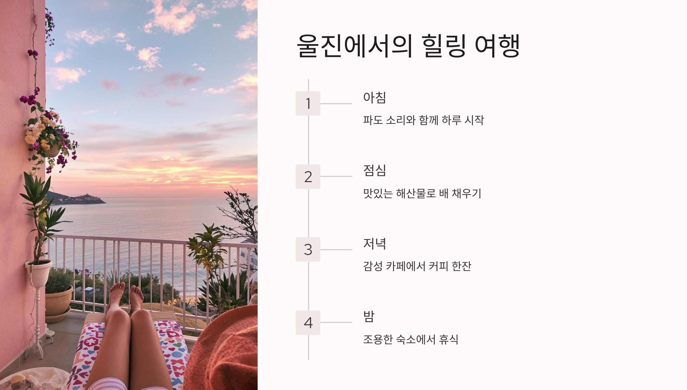 울진 바다뷰 숙소의 매력을 한 문장으로 말하자면 "침대에 누워 일출을 본다"가 아닐까요? 단순히 경치만 좋은 게 아니라, 삶의 리듬이 바다의 리듬으로 맞춰지는 느낌이에요. 아래의 이유들을 보면 왜 다들 바다뷰 숙소에 반하는지 이해가 되실 거예요.