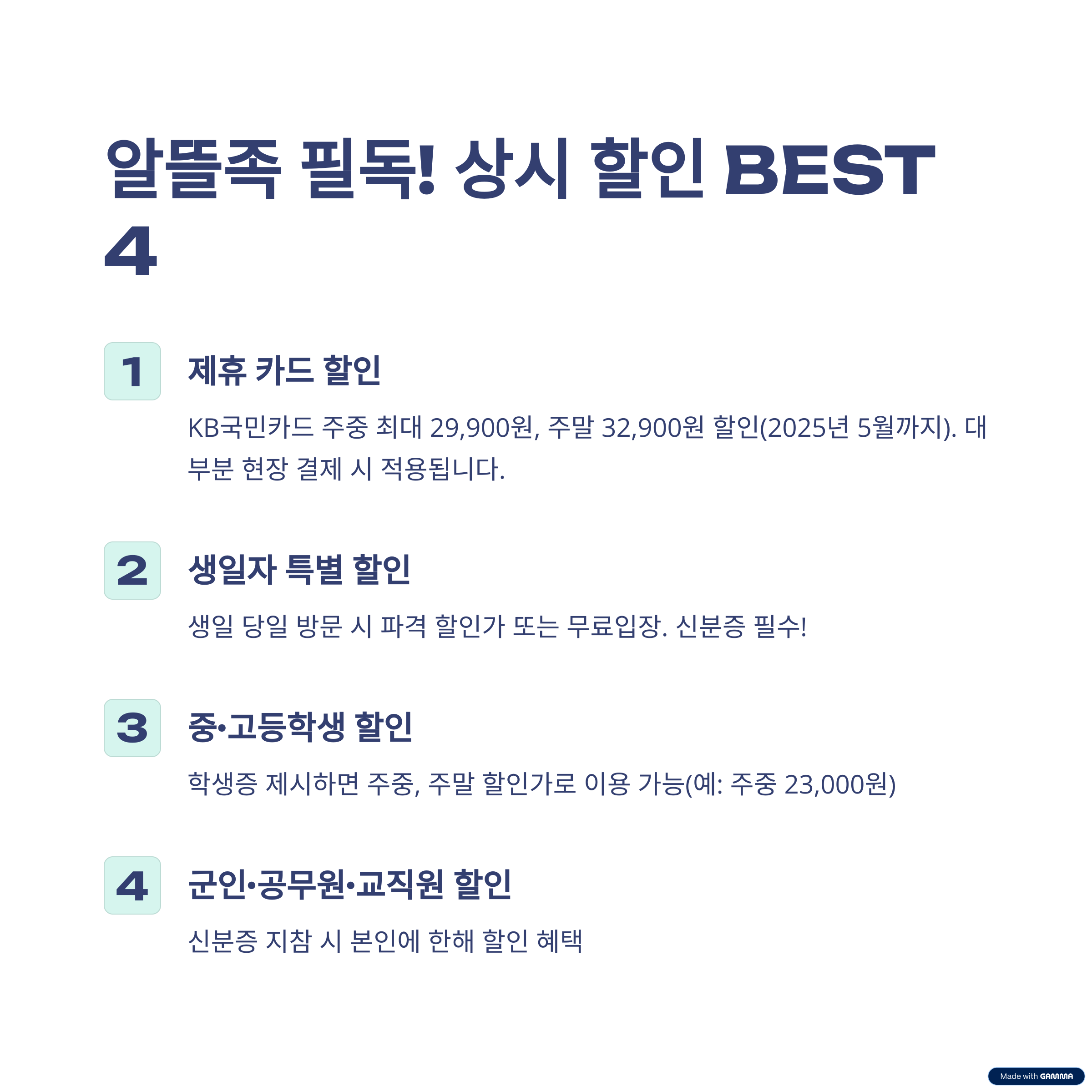 할인 정보만큼 중요한 것이 바로 준비물과 이용 팁입니다. 놓치기 쉬운 정보들까지 꼼꼼하게 챙겨서 불편함 없이 즐거운 시간을 보내세요.