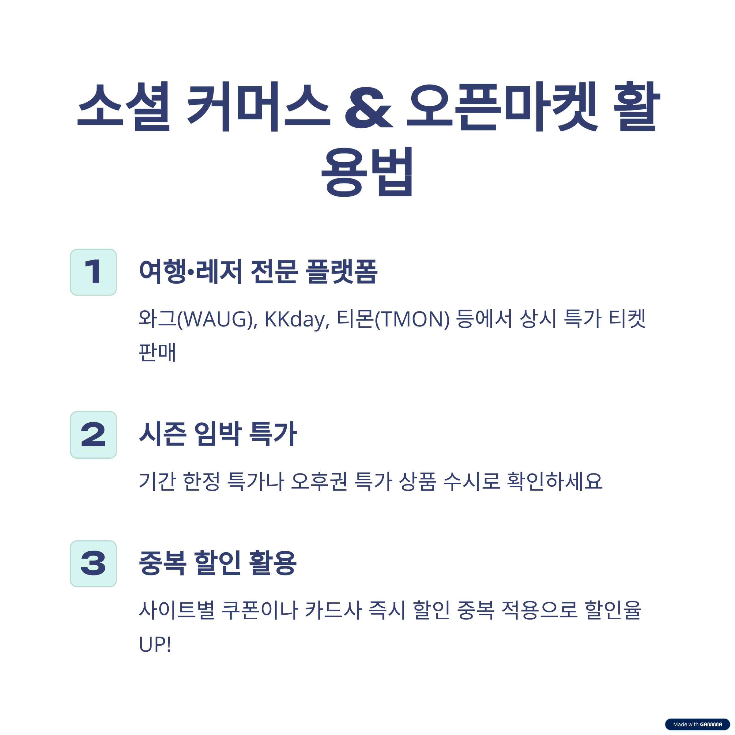 위와 같은 여행·레저 전문 플랫폼에서는 상시 특가 티켓을 판매합니다. 특히 시즌이 임박하면 기간 한정 특가오후권 특가 상품이 올라오므로, 방문 계획이 잡혔다면 수시로 확인하는 것이 좋습니다.