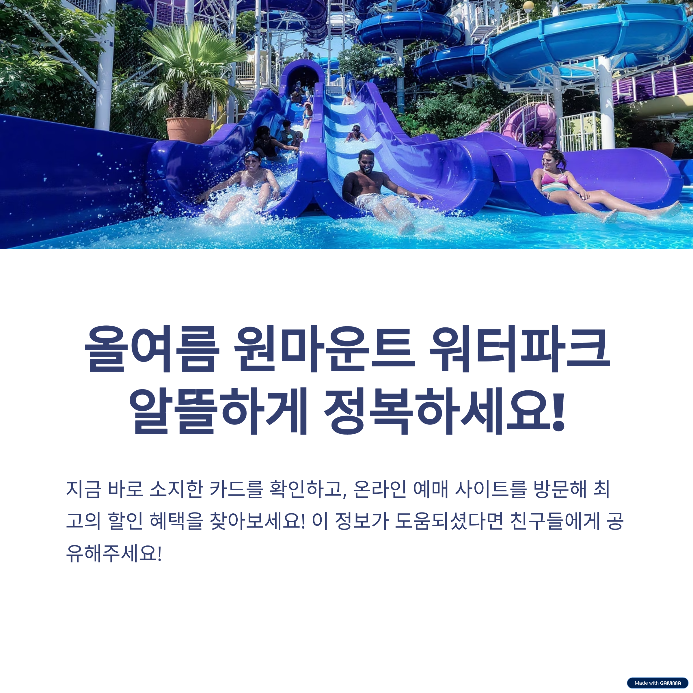 이 글을 통해 얻은 정보로 꼼꼼하게 계획을 세우신다면, 올여름 누구보다 알뜰하고 시원하게 원마운트 워터파크를 정복하실 수 있을 겁니다. 지금 바로 소지한 카드를 확인하고, 온라인 예매 사이트를 방문해 최고의 할인 혜택을 찾아보세요!