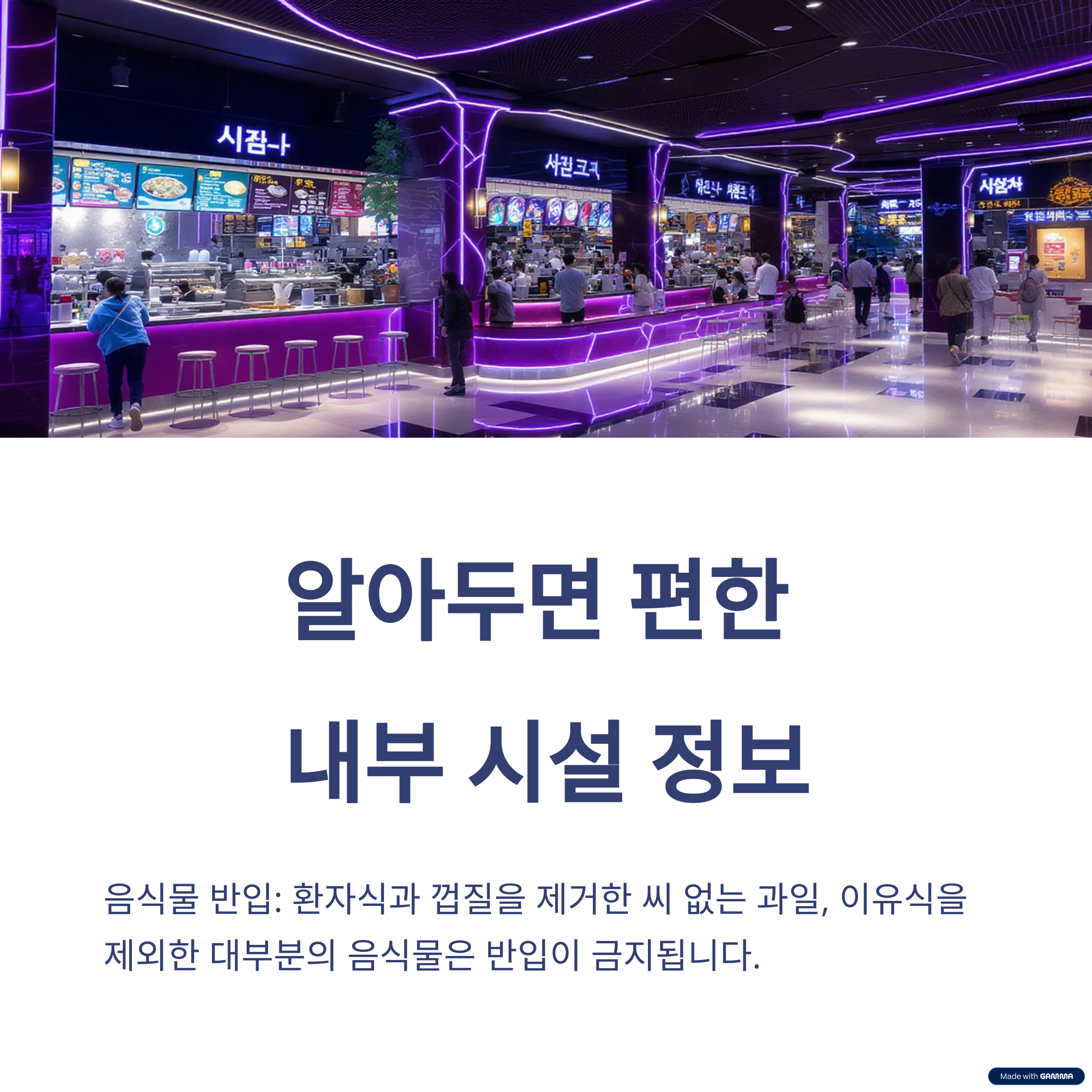 • 음식물 반입: 환자식과 껍질을 제거한 씨 없는 과일, 이유식을 제외한 대부분의 음식물은 반입이 금지됩니다. 내부에 롯데리아, 분식 등 다양한 식음 시설이 입점해 있습니다.