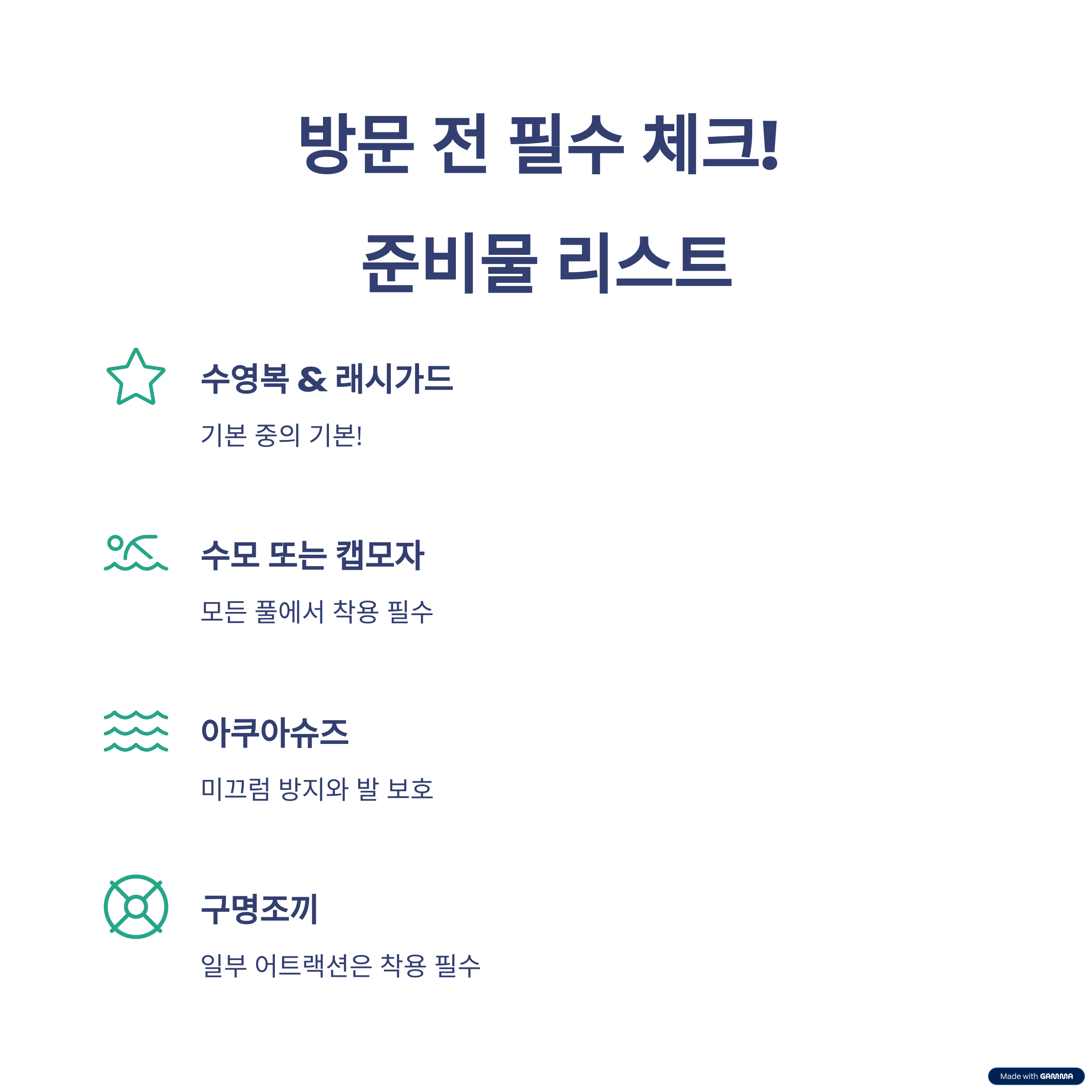• 구명조끼: 유료 대여(약 7,000원)가 가능하지만, 아이가 있거나 개인 장비가 있다면 챙겨가는 것을 추천합니다. 파도풀 등 일부 어트랙션은 구명조끼 착용이 필수입니다.
