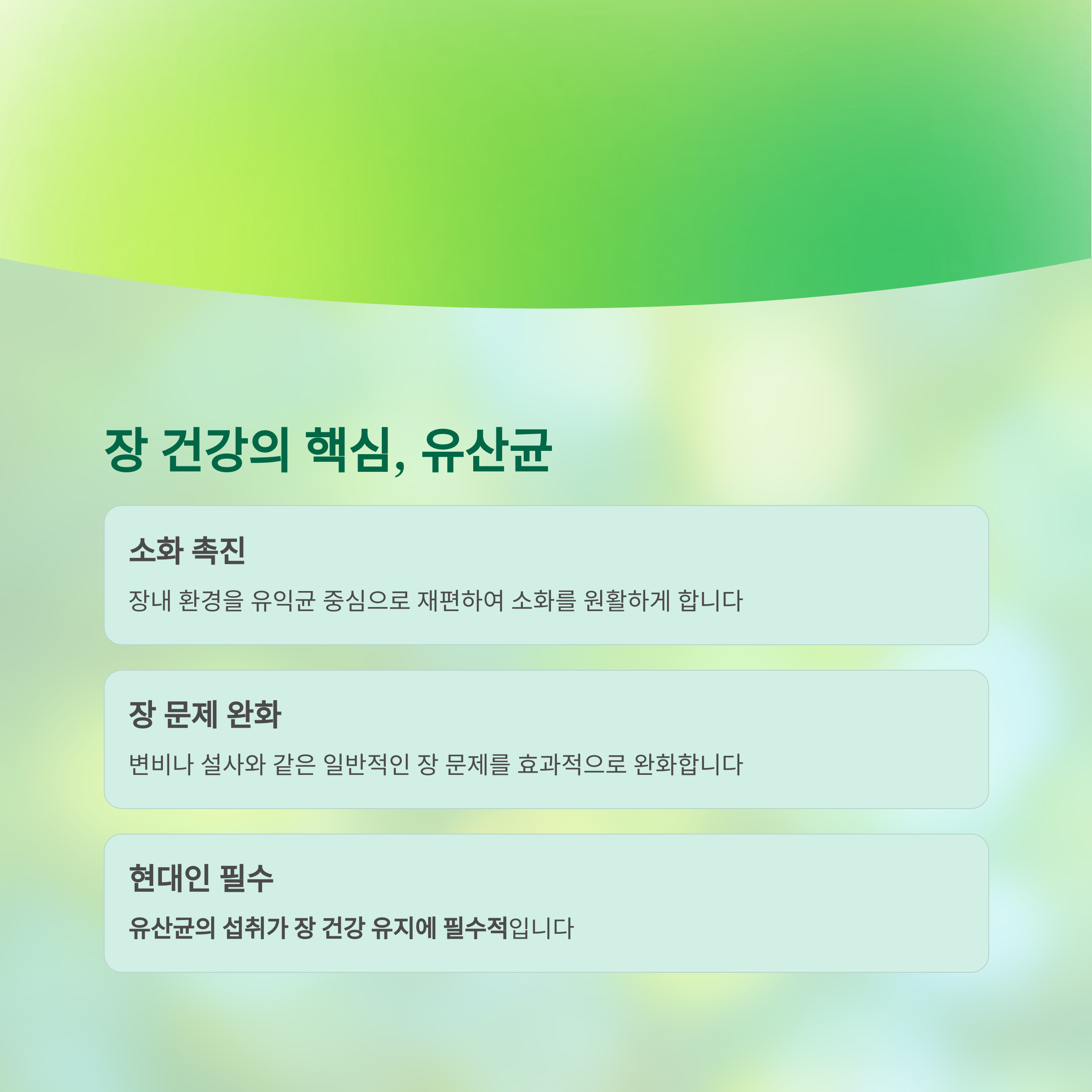 유산균의 섭취가 장 건강 유지에 필수적이라 할 수 있습니다.