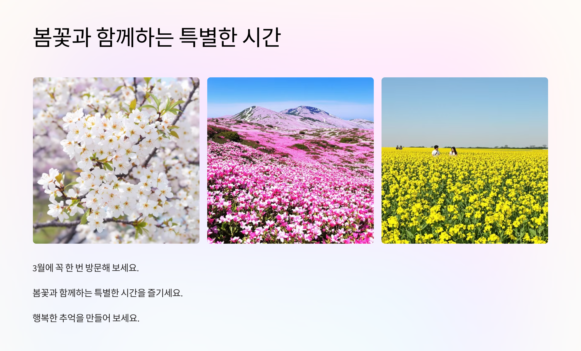 이번 포스트에서 소개한 꽃길들에서 행복한 추억을 만들어 보세요. 그럼, 다음에도 봄의 아름다움을 더 많이 나눌게요!
