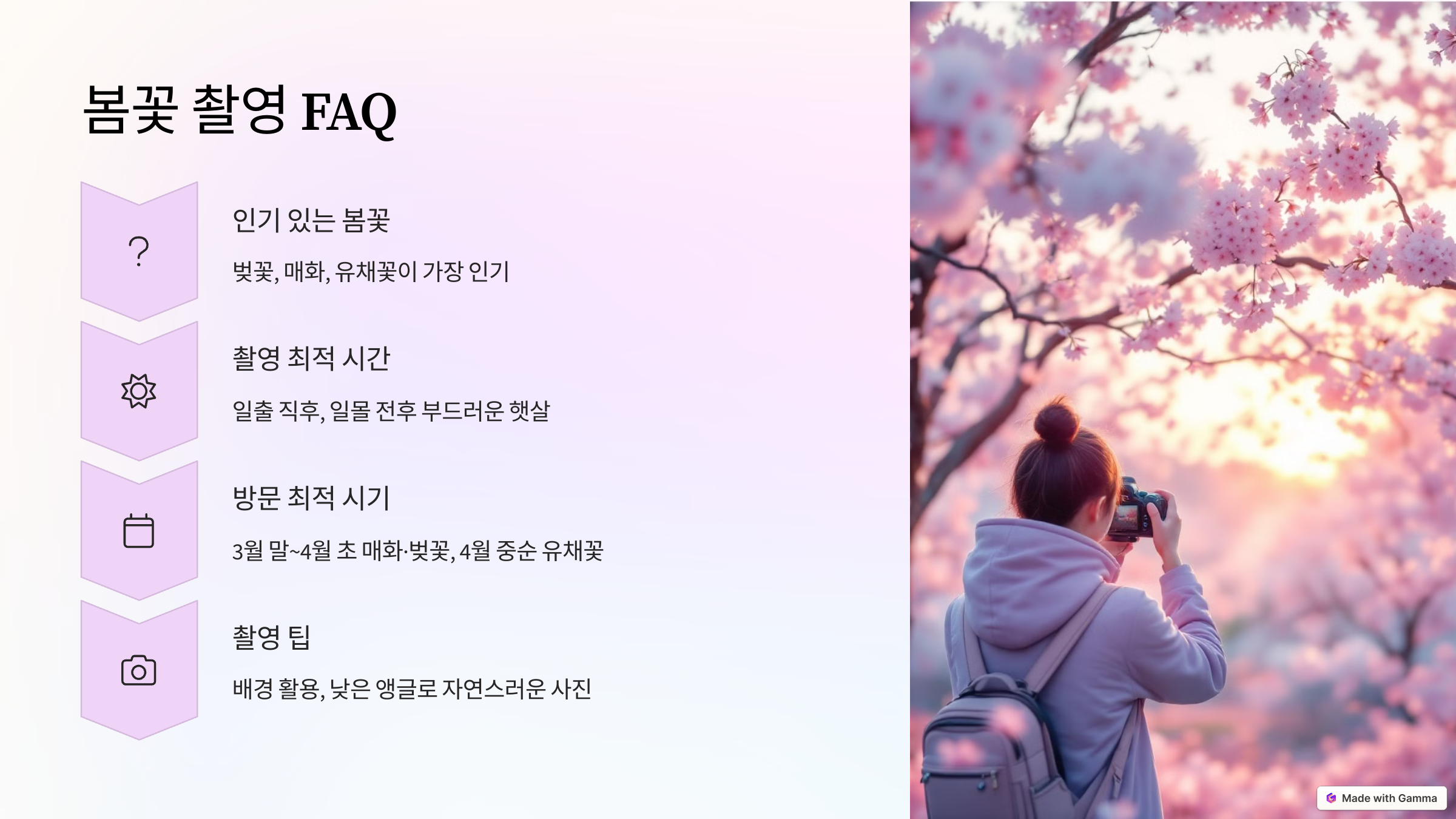 봄꽃은 아침과 오후의 햇살이 부드럽게 비추는 시간이 촬영에 가장 적합해요. 특히, 일출 직후나 일몰 전후의 시간대는 자연광이 부드러워서 사진이 더욱 아름답게 나옵니다.