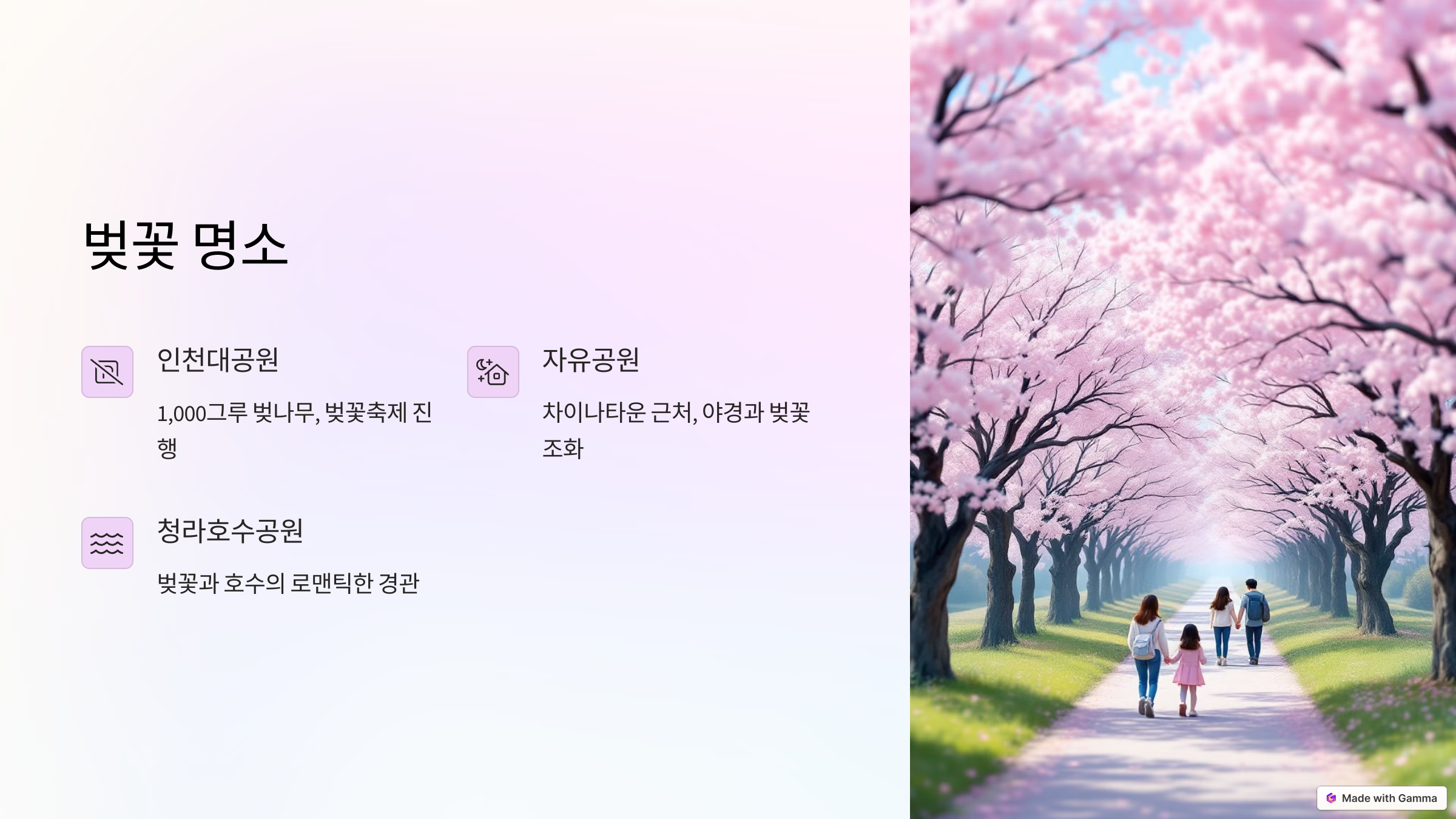 인천대공원은 인천에서 가장 큰 도시공원으로, 봄이면 벚꽃이 만개하여 많은 사람들이 찾는 명소예요.