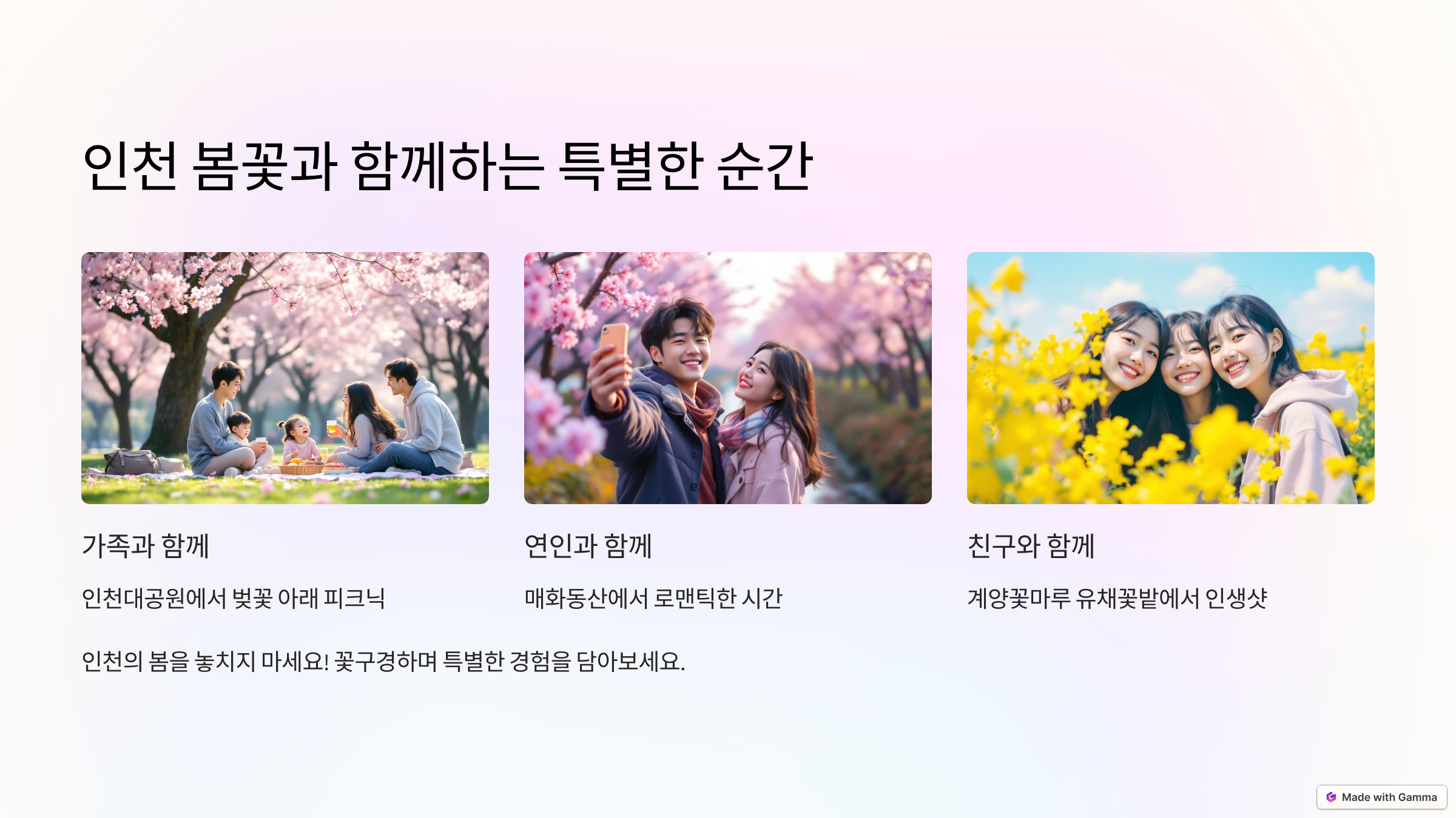인천의 봄꽃 명소들은 단순히 꽃만 보는 것이 아니라, 그 자체로 특별한 경험을 선사합니다. 꽃구경을 하며 인천의 자연과 문화 속에서 나만의 아름다운 순간을 담아 보세요. 사진을 찍고, 그 순간을 오래도록 기억에 남길 수 있을 거예요. 친구, 가족, 연인과 함께, 혹은 혼자서도 좋습니다. 인천의 봄을 놓치지 마세요!