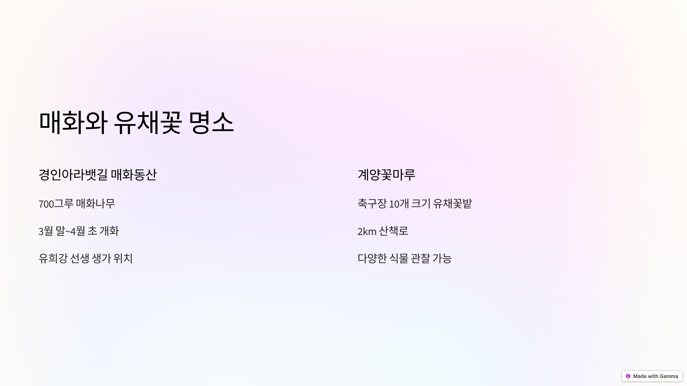 경인아라뱃길 매화동산은 약 700그루의 매화나무가 자랑하는 아름다운 매화 명소예요. 3월 말부터 4월 초까지가 개화 시기라, 이 시기에 방문하면 매화와 함께 전통적인 배경에서 사진을 찍을 수 있어요. 또한, 서예가 유희강 선생의 생가도 있어 역사적인 분위기도 함께 느낄 수 있답니다.