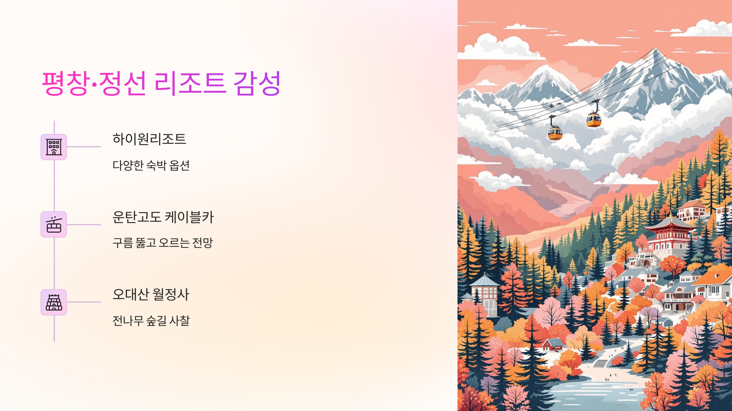겨울 스포츠의 천국, 평창과 정선! 눈 내리는 산속에서 보내는 하룻밤은 정말 영화 같아요. 하이원리조트는 그 중심에 있어요. 리프트 타고 올라가 내려다보는 설경은 한 폭의 그림이고요, 다양한 숙박 옵션이 있어 취향 따라 선택할 수 있어요.