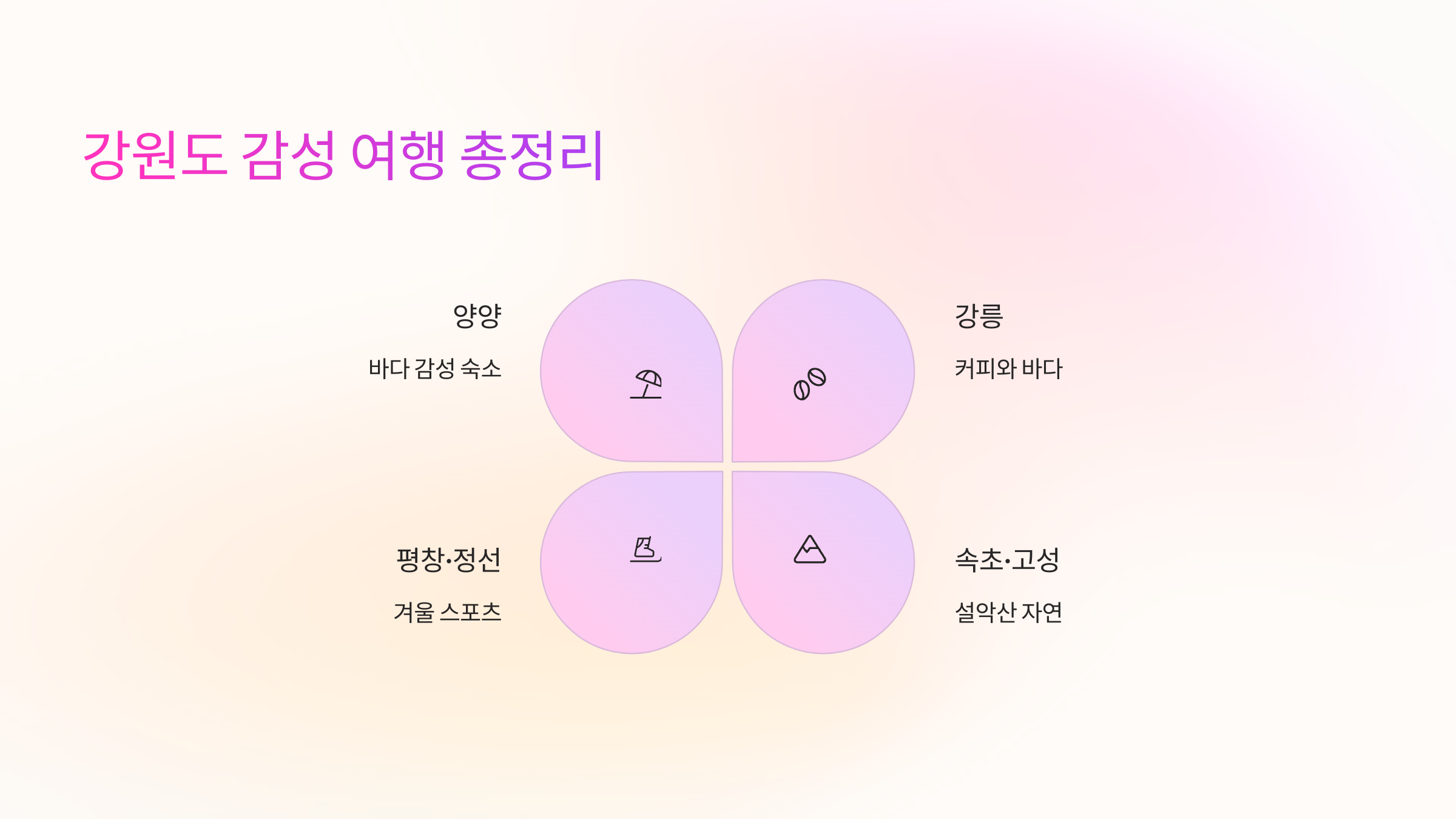 양양, 강릉, 속초, 고성, 평창, 정선. 강원도엔 감성 충만한 숙소와 볼거리, 맛집, 카페가 가득하죠. 이 모든 걸 하루 만에 다 즐길 순 없지만, 최소한 두 곳만이라도 다녀온다면 ‘아, 잘 다녀왔구나’ 싶은 그런 여운이 남을 거예요. 일상에 지친 당신에게 딱 필요한 그 공간, 지금 떠나보는 건 어때요?