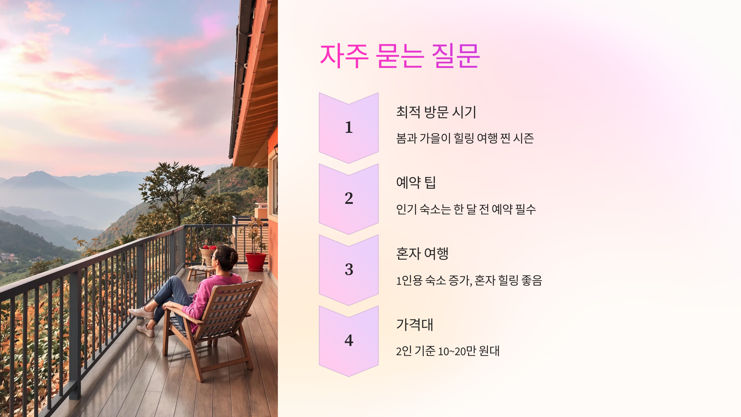 물론이죠! 혼자 조용히 힐링하기 딱 좋은 곳이에요. 1인용 숙소도 점점 많아지고 있어요.
