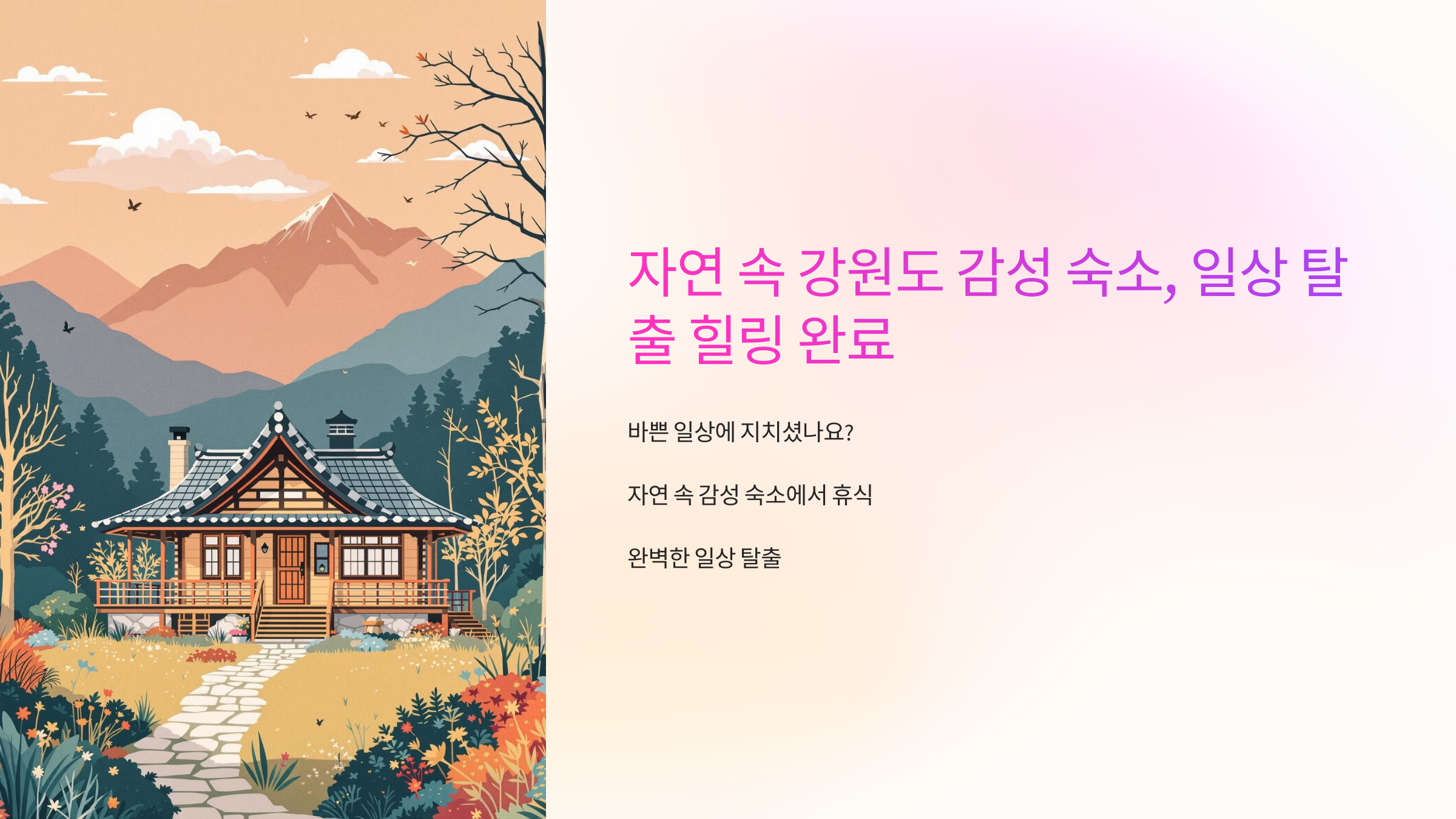 이번 주말, 가볍게 짐을 싸서 떠나보는 건 어때요? 강원도의 자연이 여러분을 따뜻하게 맞이해 줄 거예요. 댓글로 여러분이 다녀온 감성 숙소나 추천하고 싶은 장소도 함께 나눠주세요!