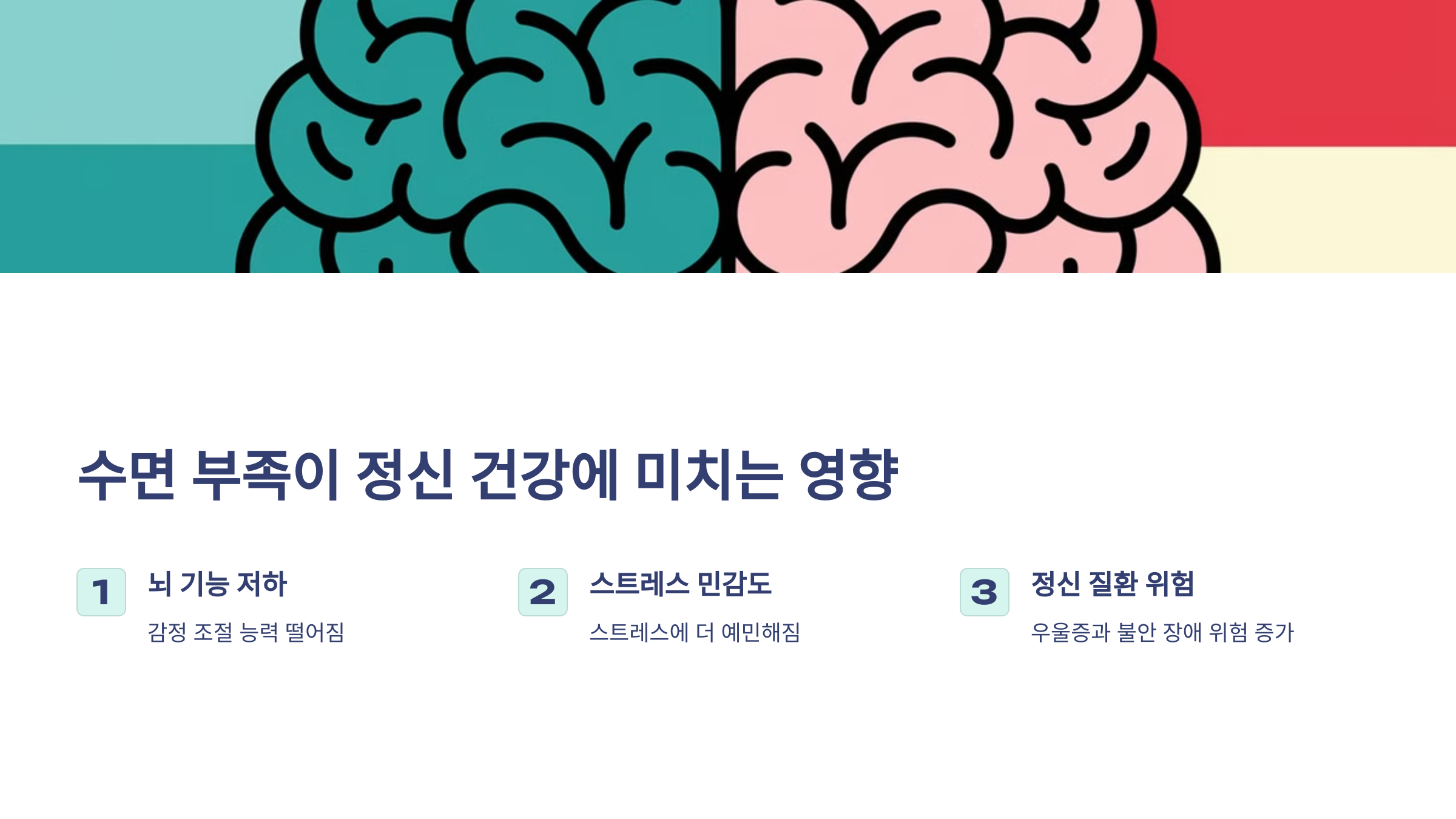 충분한 수면을 취하지 않으면 뇌의 감정 조절 능력이 떨어지고, 스트레스에 더 예민해지며, 우울증과 불안 장애의 위험도 높아져요. 실제 연구에서도 만성적인 수면 부족이 우울증과 관련이 있다는 결과가 나왔습니다.