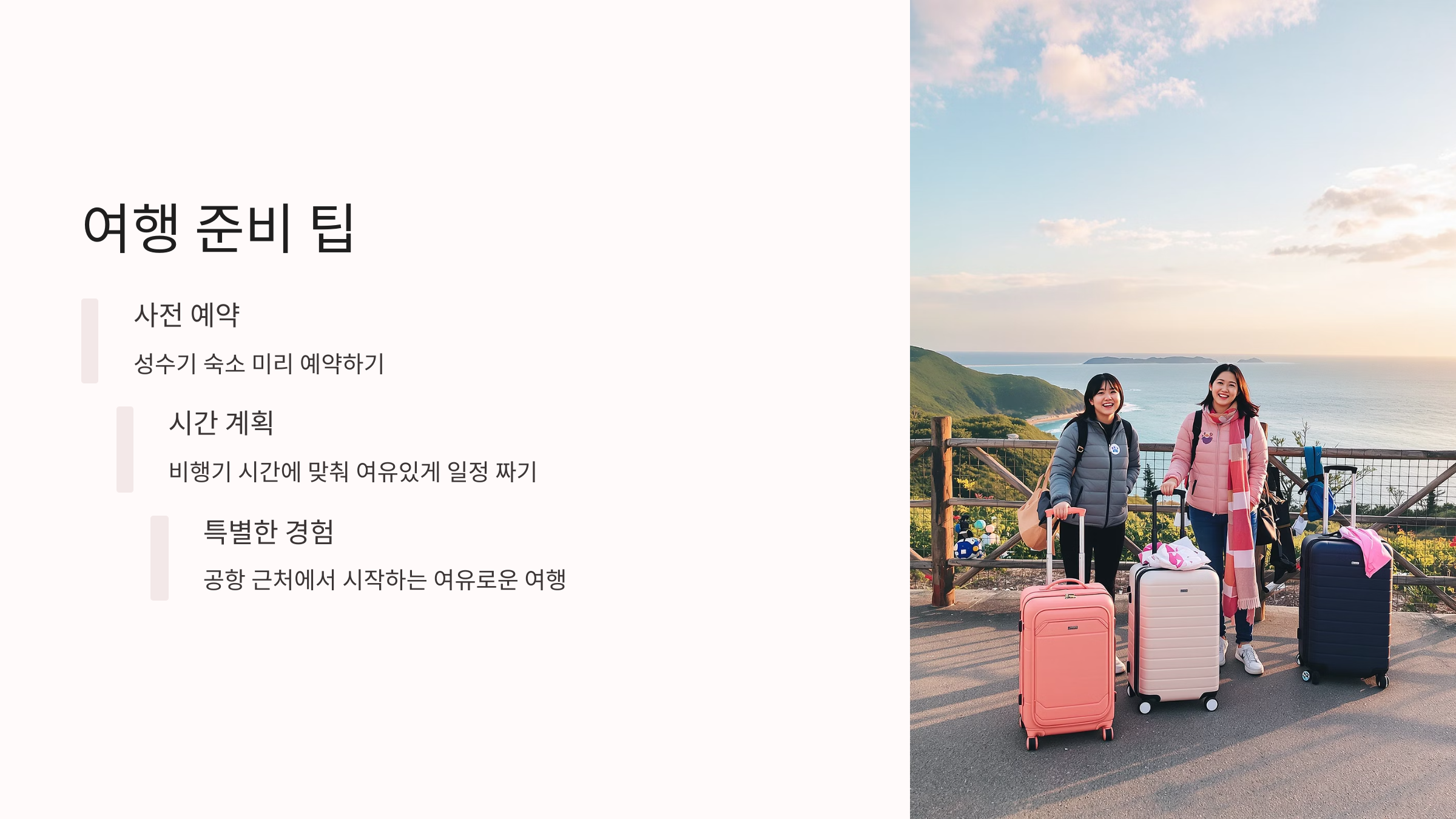 여행 준비를 할 때, 성수기에는 숙소 예약을 미리 해두는 것이 좋고, 카페나 맛집은 비행기 시간에 맞춰 여유 있게 방문할 수 있도록 계획을 세우세요. 제주에서의 첫날을 공항 근처에서 시작하는 여행은 정말 특별하고 여유로운 경험이 될 것입니다.