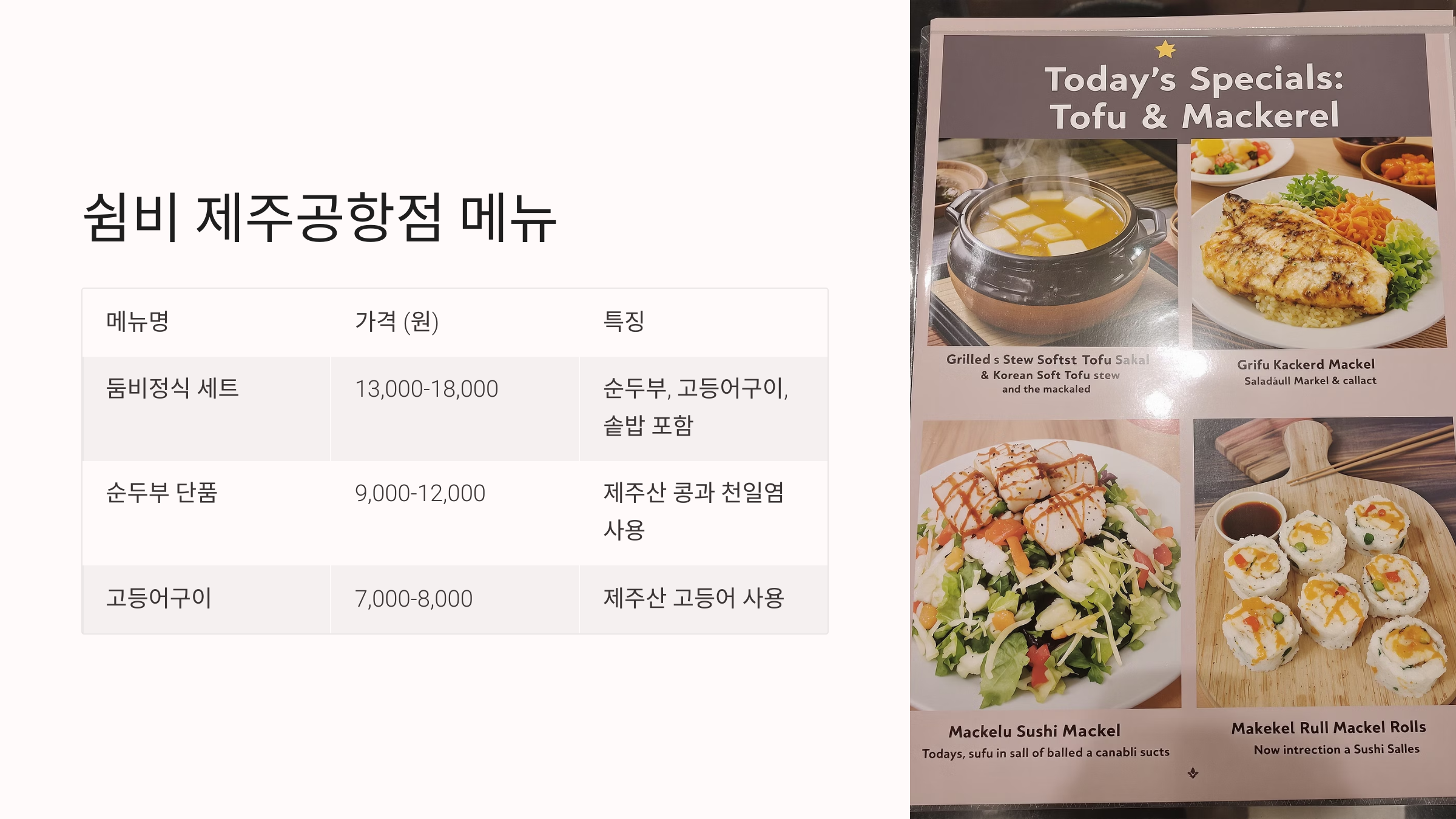- 제주공항 도착 후, 쉼비 제주공항점에서 수제두부와 고등어로 아침 식사