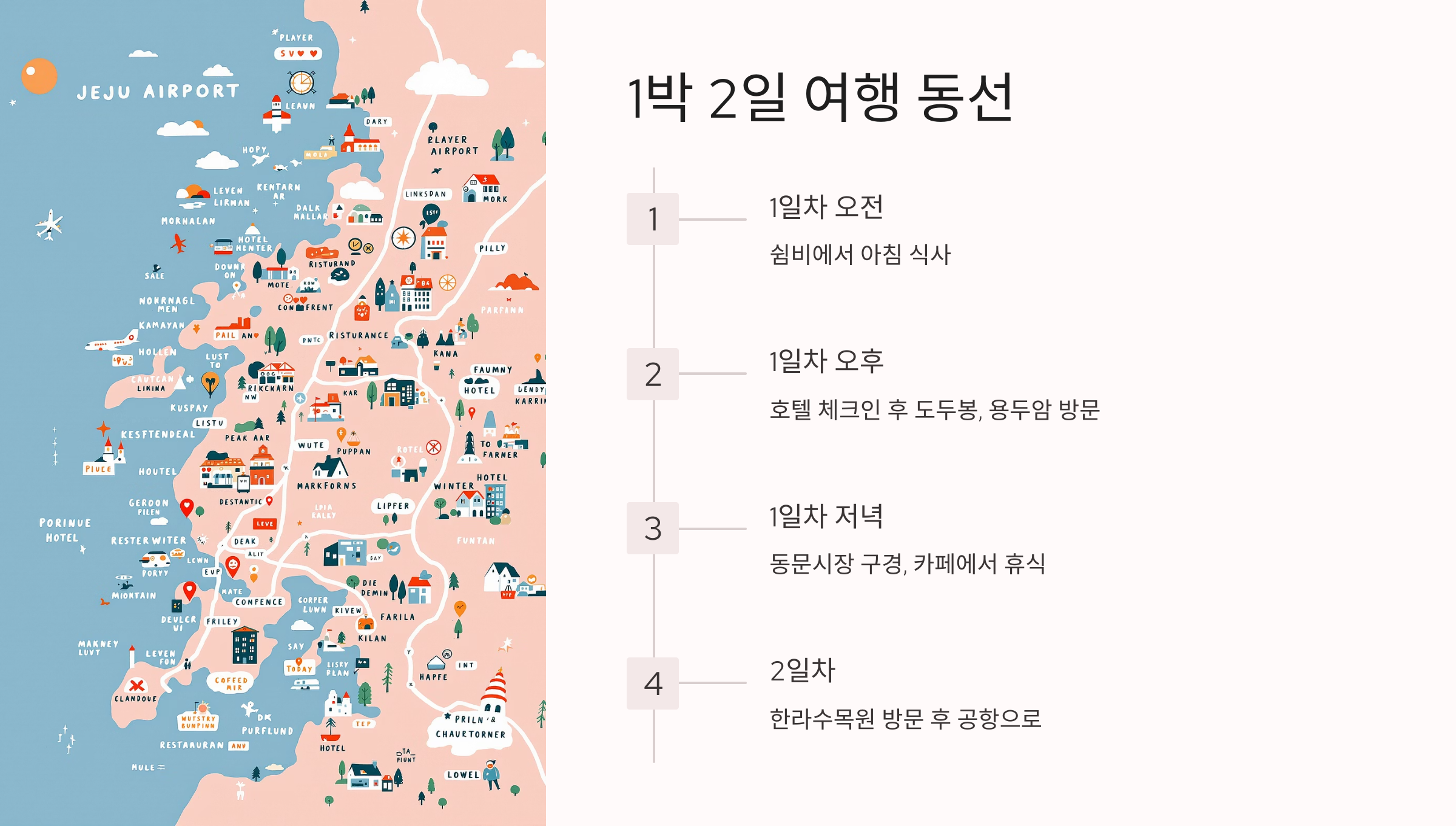 제주공항 근처에서 1박 2일 동안 여행을 즐길 수 있는 일정도 추천해 드릴게요. 제주 도착 후 바로 여행을 시작하면서 제주만의 매력을 만끽할 수 있도록 동선을 짜 보았습니다. 맛집과 카페, 관광지를 즐기고 여유로운 하루를 보내세요.