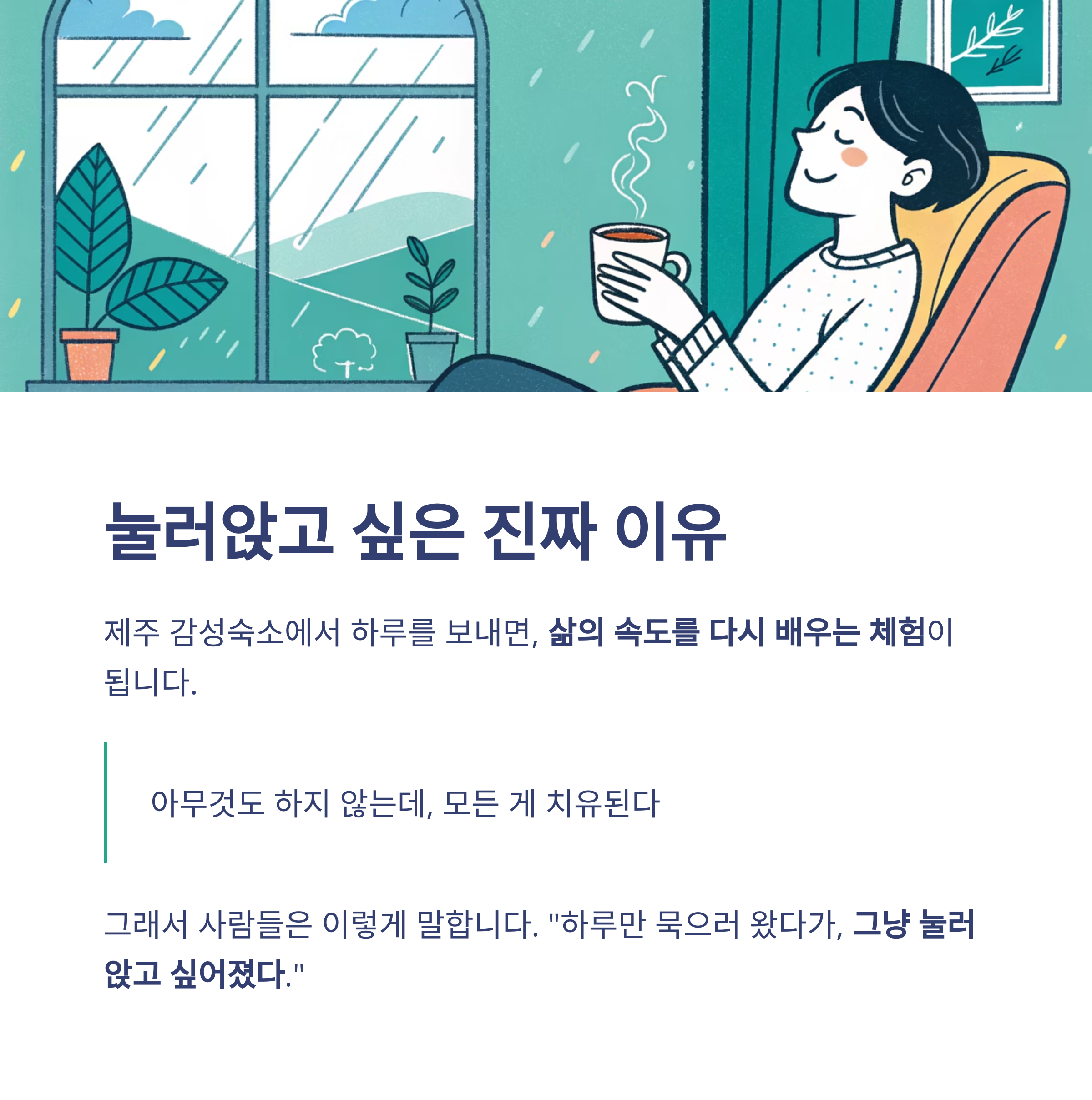 | 오전 | 창밖으로 보이는 돌담과 바다 | 느긋함과 시작의 설렘 |