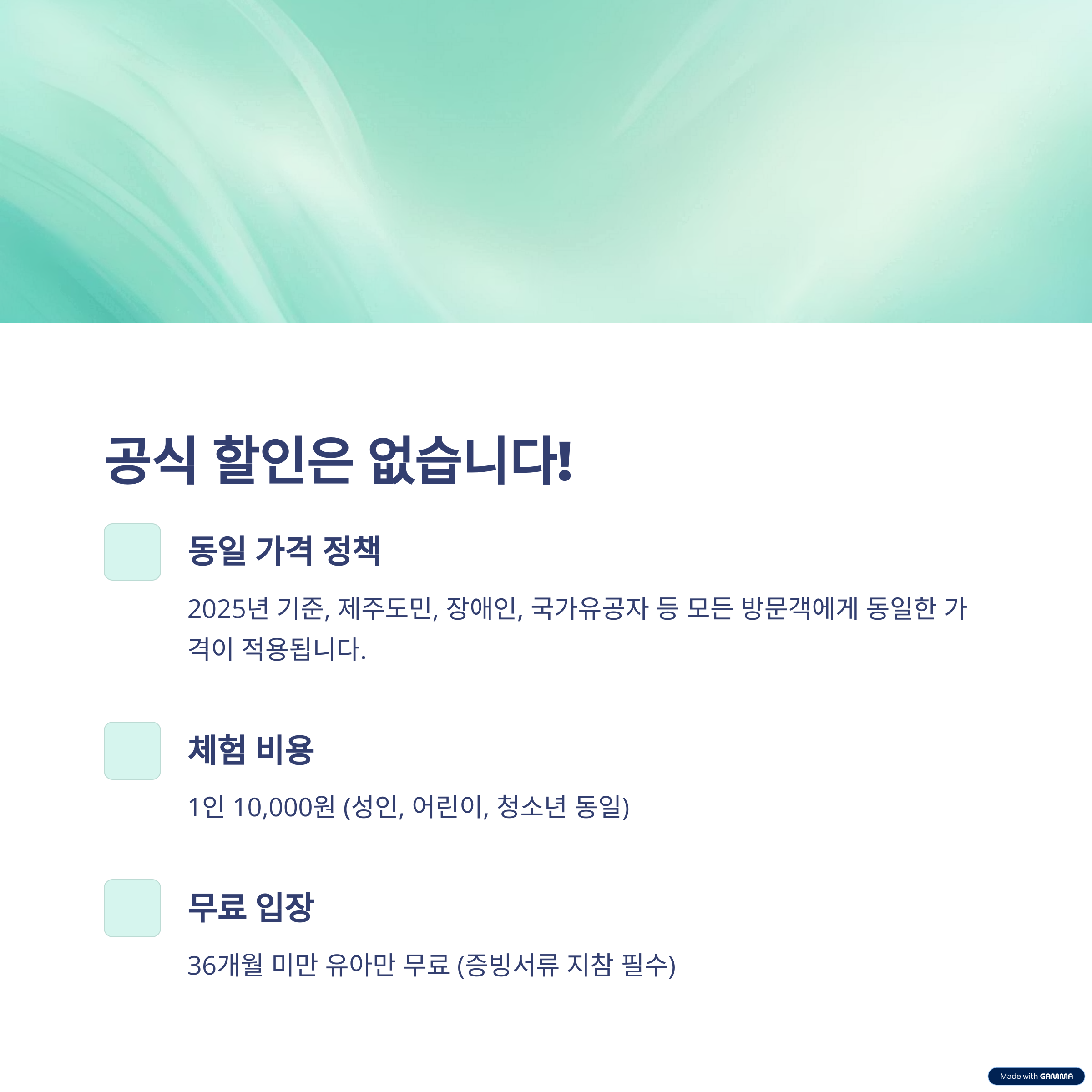 하지만 이 신비로운 체험을 앞두고 많은 분이 가장 궁금해하는 것이 바로 '할인 정보'일 텐데요. "제주도민 할인은 없나요?", "카드로 할인받을 수 있나요?" 등 헷갈리는 정보들 사이에서 헤매고 계셨다면, 이 글 하나로 모든 궁금증을 해결해 드리겠습니다.