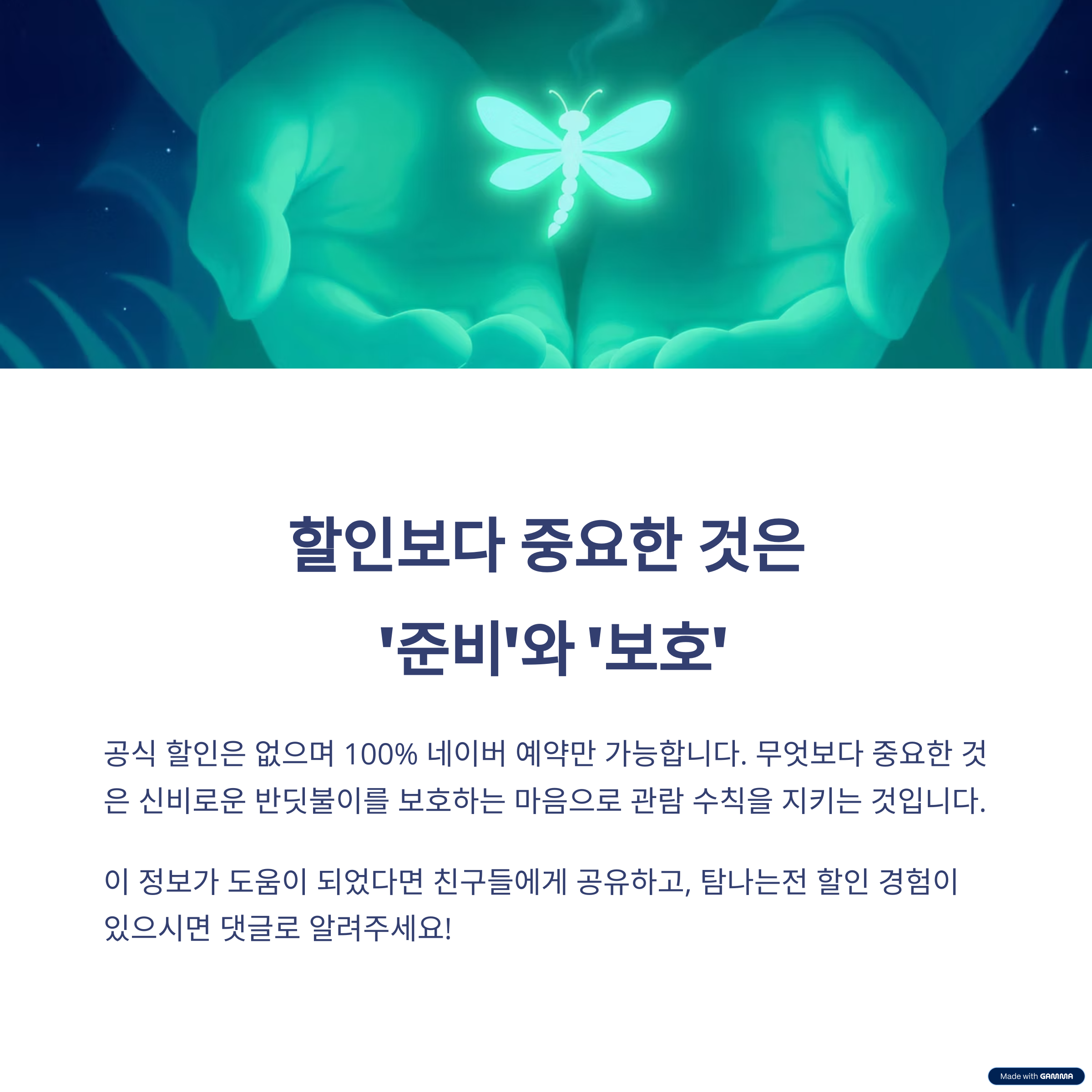 다시 한번 강조하지만, 공식적인 할인은 없으며 100% 네이버 예약으로만 참여할 수 있습니다. '탐나는전' 할인은 확실하지 않으니 큰 기대는 금물! 무엇보다 중요한 것은 신비로운 반딧불이를 보호하는 마음으로 관람 수칙을 지키는 것입니다.