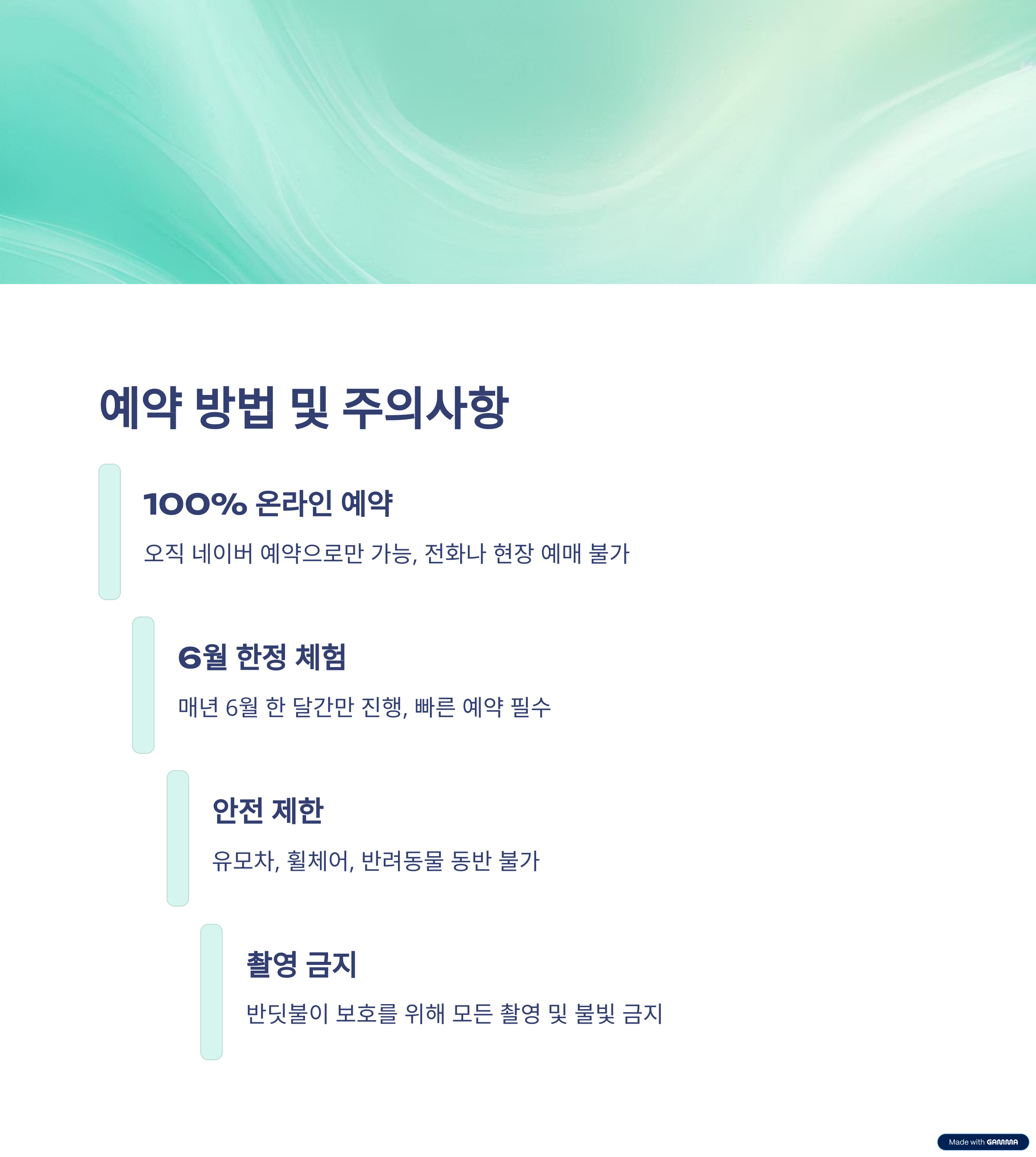 - 딱 한 달, 6월에만 열리는 기회 반딧불이 체험은 보통 매년 6월 한 달간만 진행됩니다. 2025년 정확한 날짜가 공지되면 바로 예약 전쟁에 참전할 준비를 하셔야 합니다.