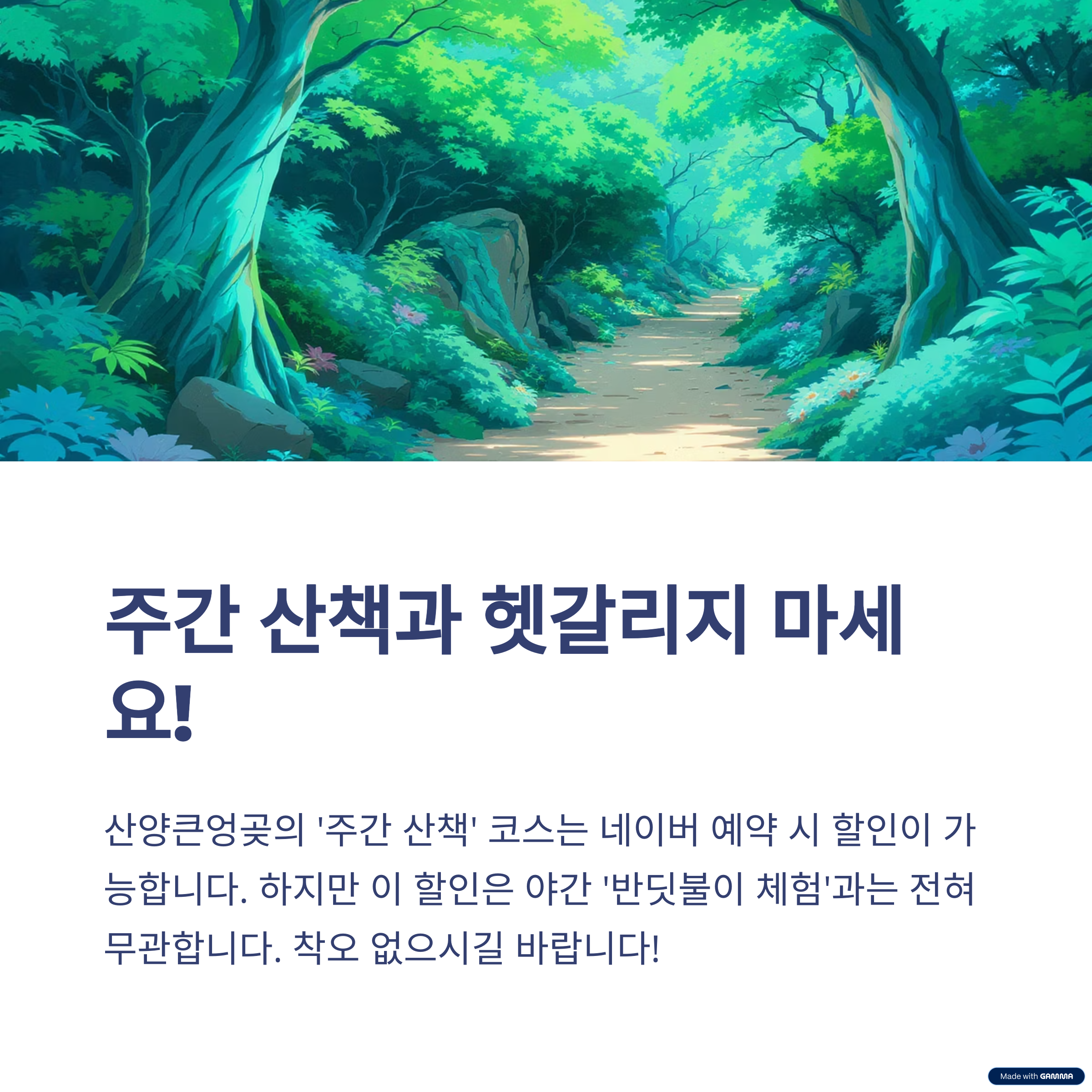 [꿀팁] 주간 산책 할인과 헷갈리지 마세요! 산양큰엉 꽂은 낮에 방문하는 '주간 산책' 코스도 있습니다. 이 주간 입장권은 네이버 예약 시 할인을 받을 수 있습니다. 하지만 이 할인은 야간에 진행되는 '반딧불이 체험'과는 전혀 무관하니 착오 없으시길 바랍니다.