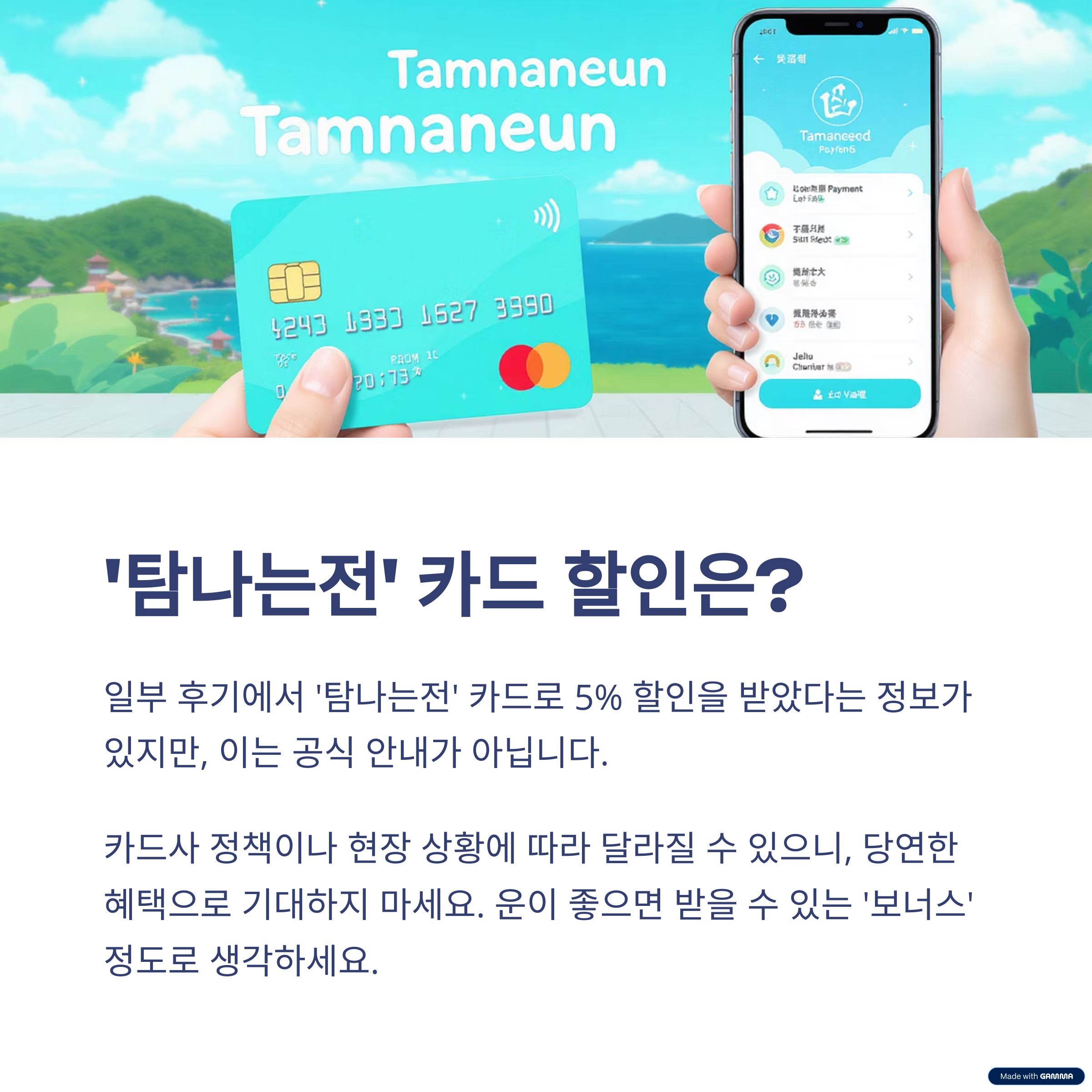 몇몇 후기 글에서 '탐나는전' 카드로 현장 결제 시 5% 할인을 받았다는 내용을 보셨을 수도 있습니다.
