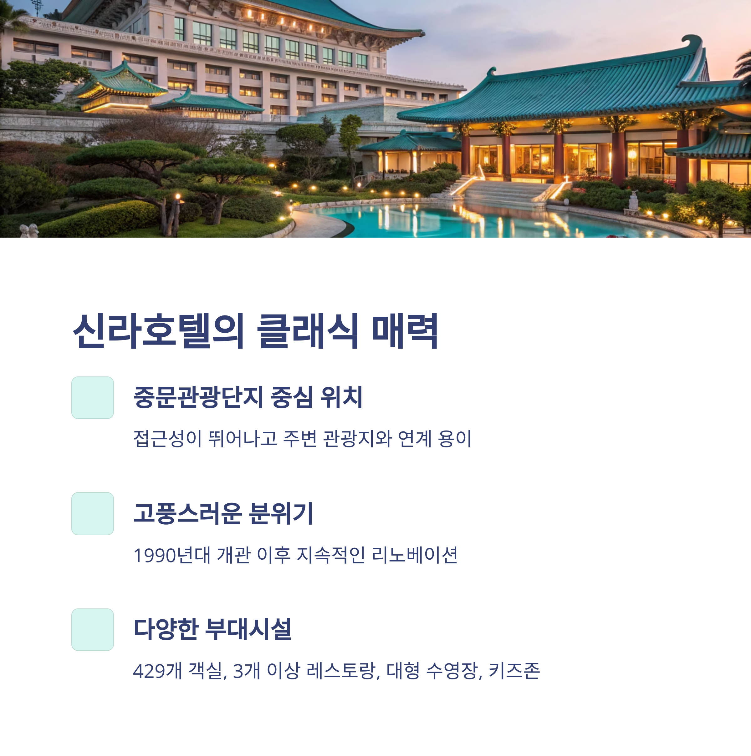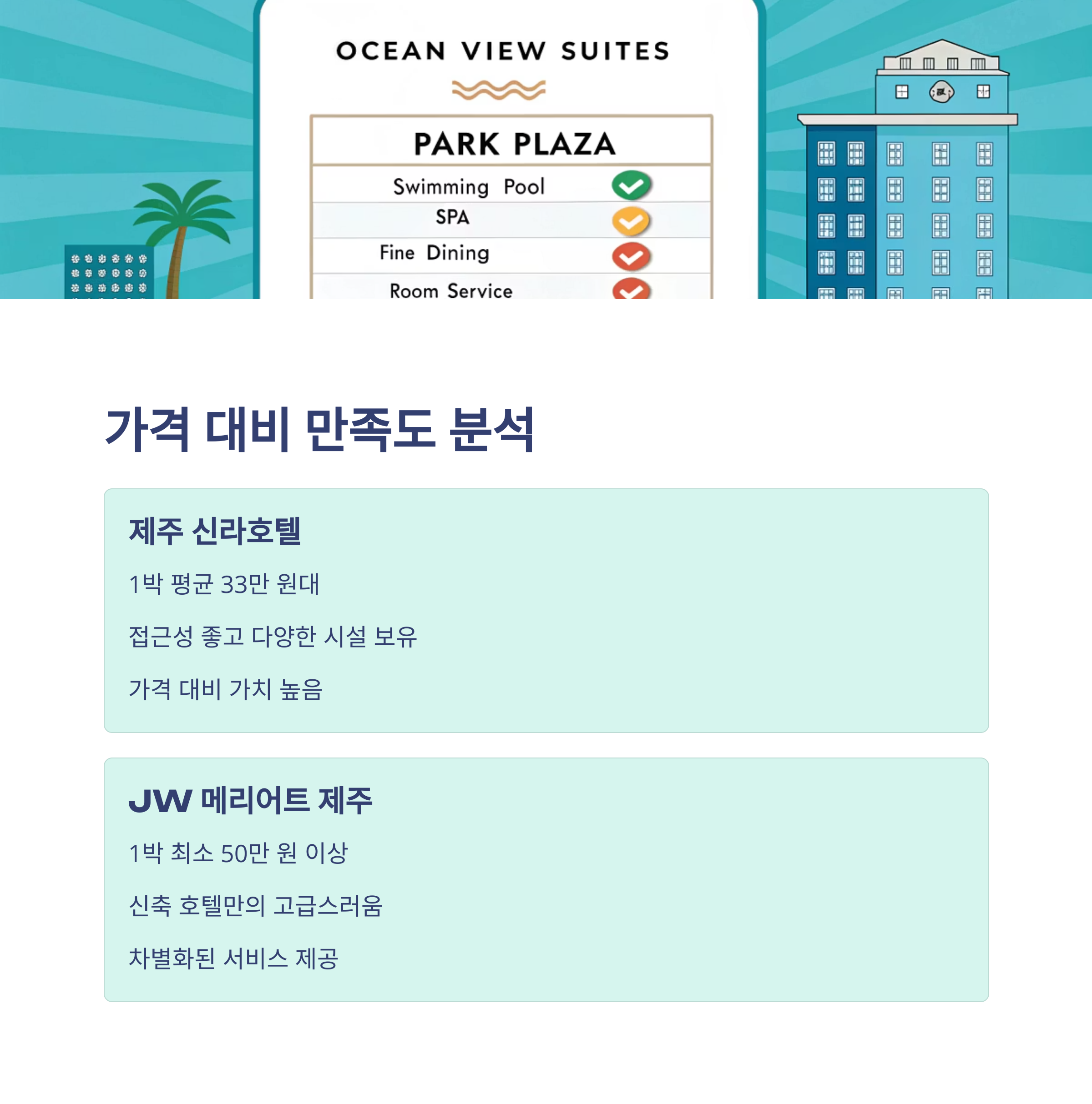 결론: 제주 신라호텔은 전통, 부대시설, 가성비에서 강점이 있으며,