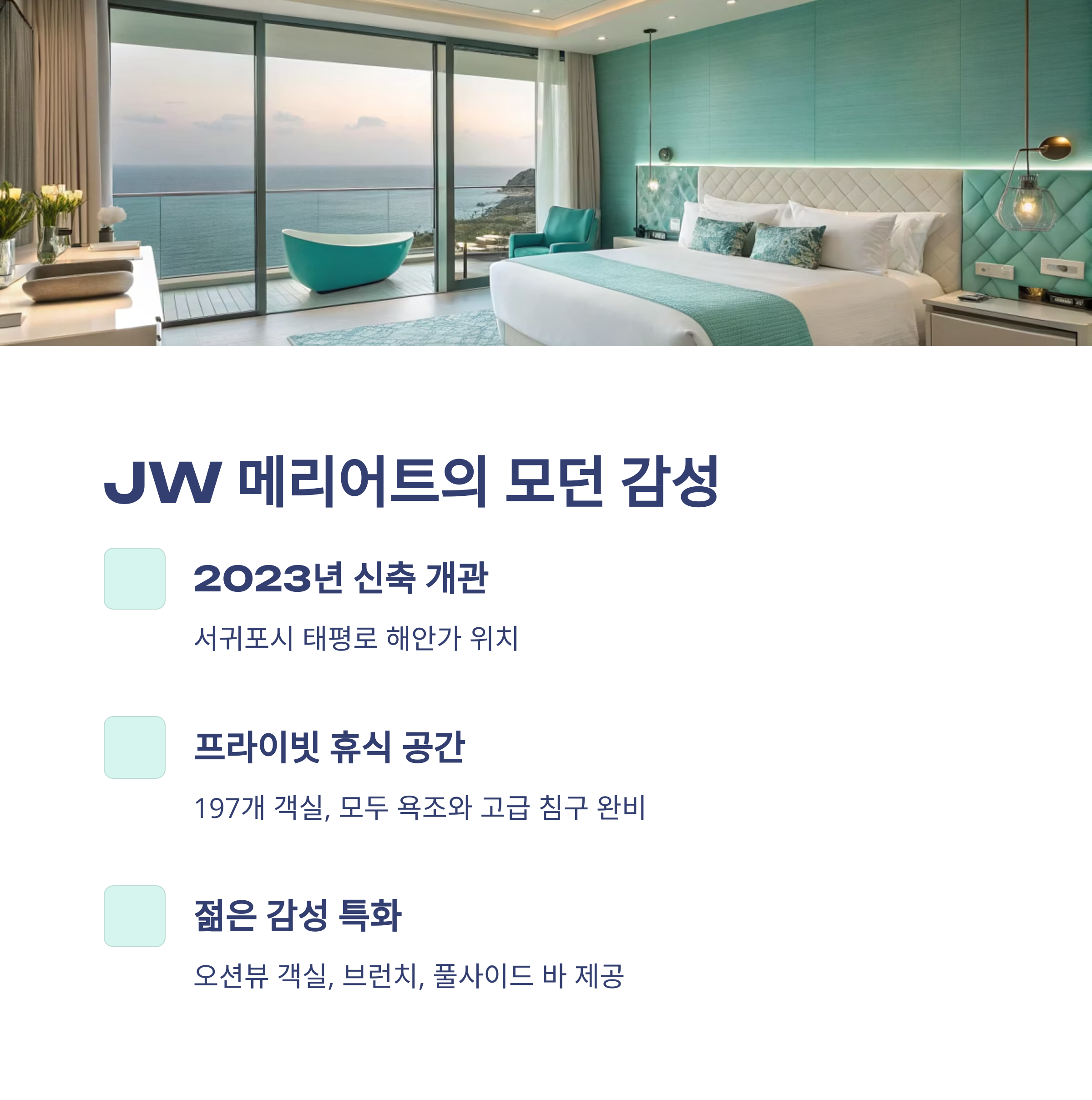 2023년에 새롭게 개관한 JW 메리어트 제주는 서귀포시 태평로 해안가에 자리 잡고 있어
