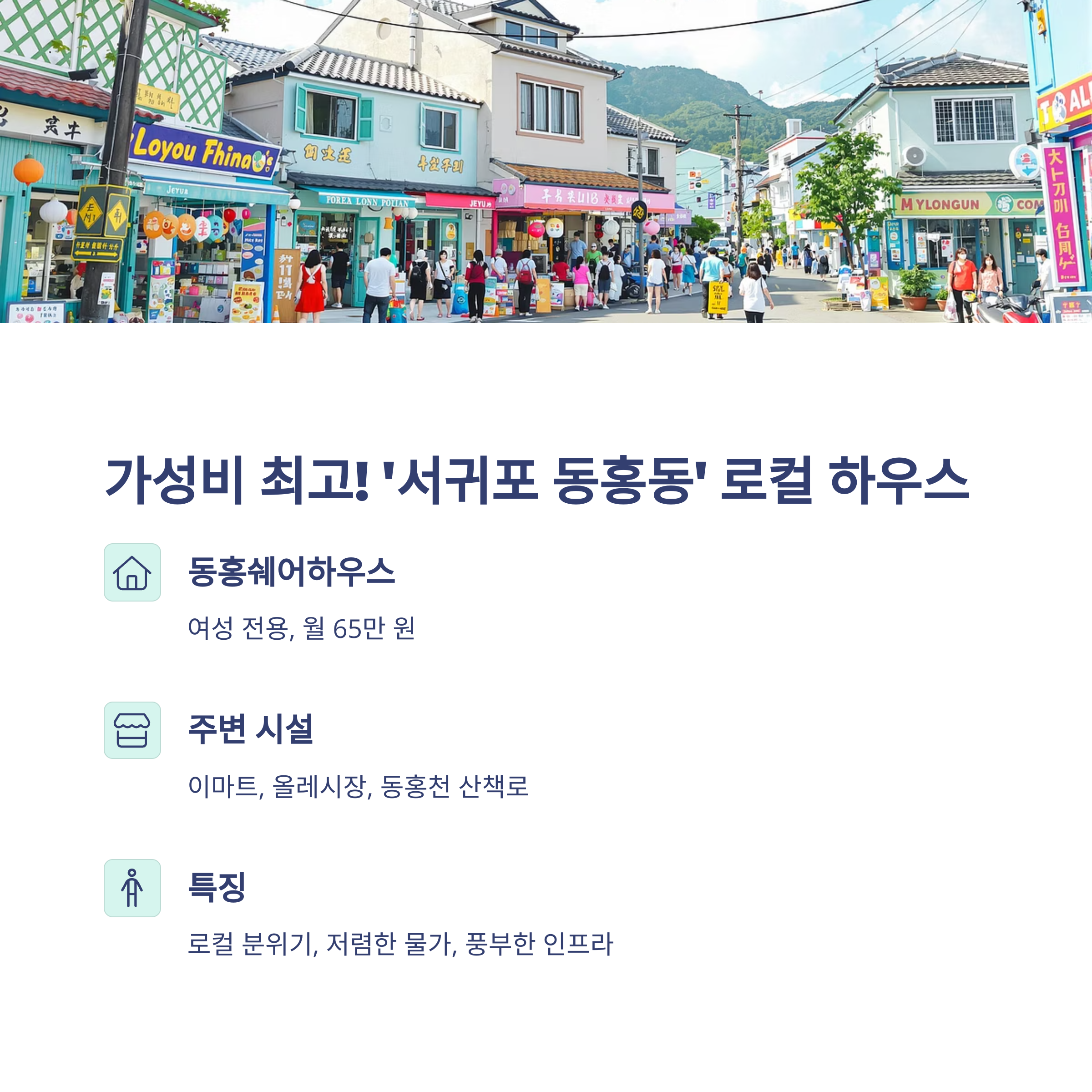 - 대표 숙소: '동홍셰어하우스' – 여성 전용, 월 65만 원
