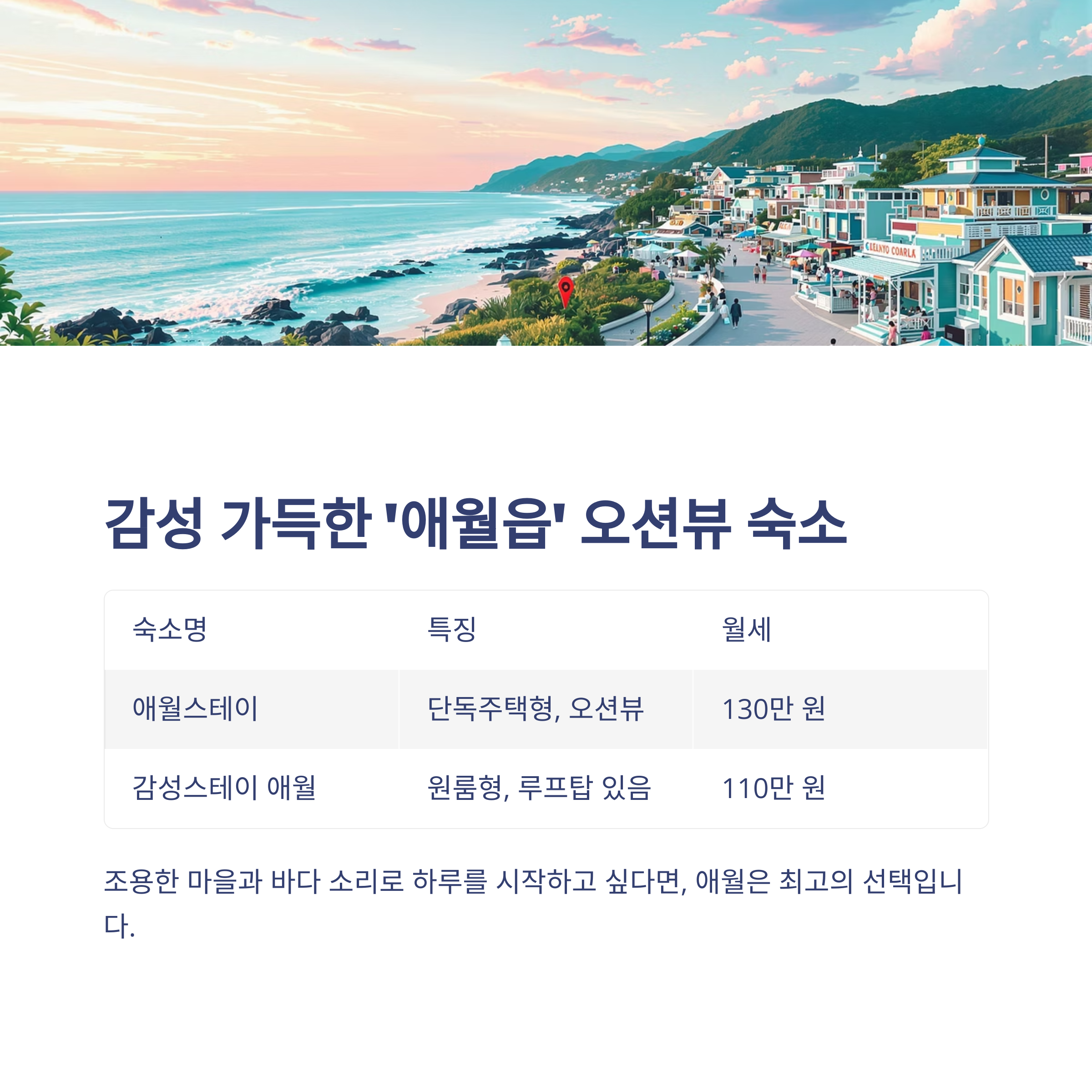 "조용한 마을과 바다 소리로 하루를 시작하고 싶다면, 애월은 최고의 선택입니다."