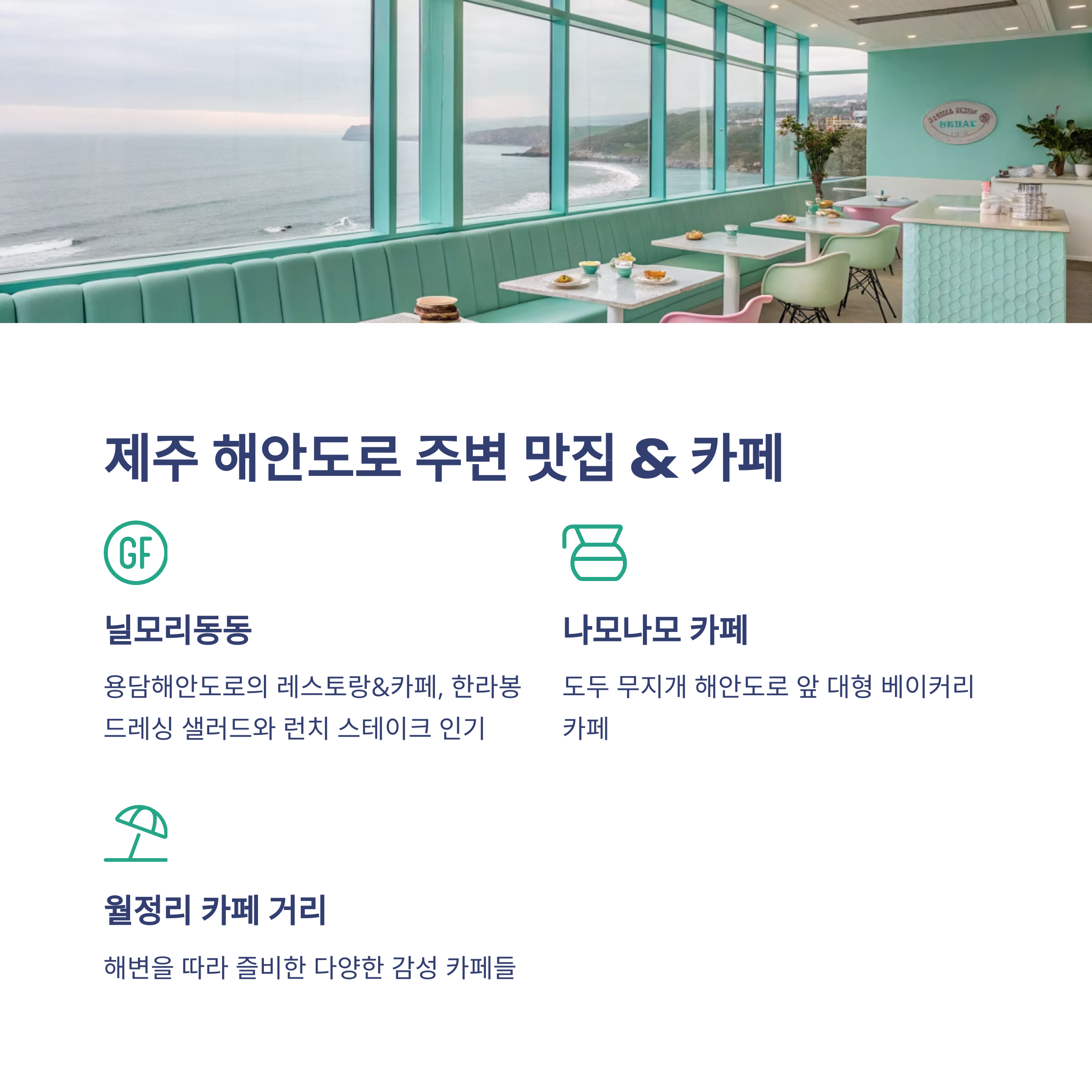 - 닐모리 동동: 제주 용담해안도로에 위치한 레스토랑&카페로, 제주를 담은 인테리어와 제주의 신선한 재료로 만든 메뉴를 제공합니다. 특히 한라봉 드레싱 계절 샐러드와 런치 스테이크가 인기 메뉴입니다.