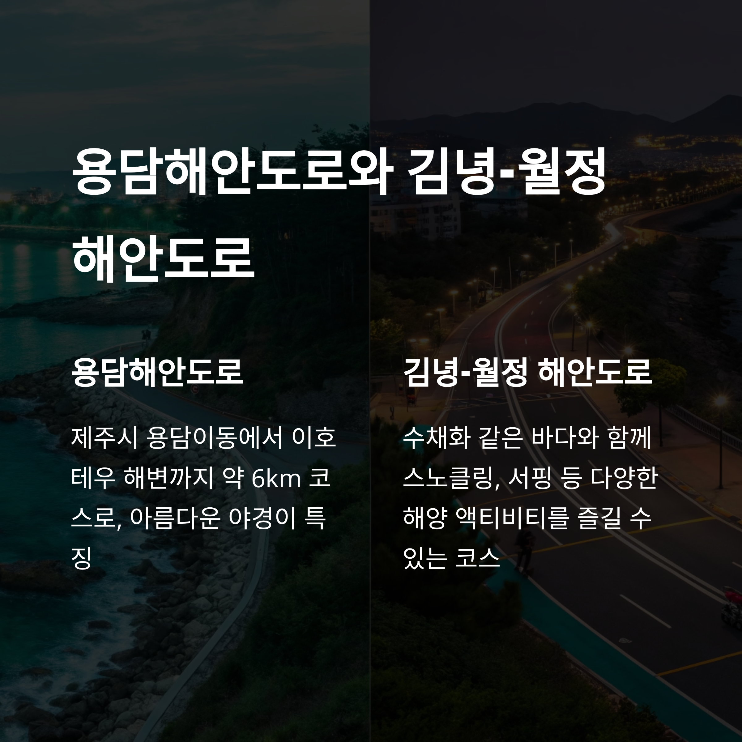제주시 용담이동에서 이호테우 해변까지 약 6km에 이르는 용담해안도로는 제주공항 북쪽의 해안을 따라 이어지는 드라이브 코스입니다. 낮에는 탁 트인 바다를 바라보며 드라이브를 즐길 수 있으며, 밤이 되면 어선의 조명들이 반짝이는 아름다운 야경을 감상할 수 있습니다. 이 도로는 올레 17코스의 일부로, 자전거를 타거나 가볍게 거닐며 운치 있는 주변의 풍경을 천천히 둘러볼 수 있어 많은 여행객에게 인기 있습니다.