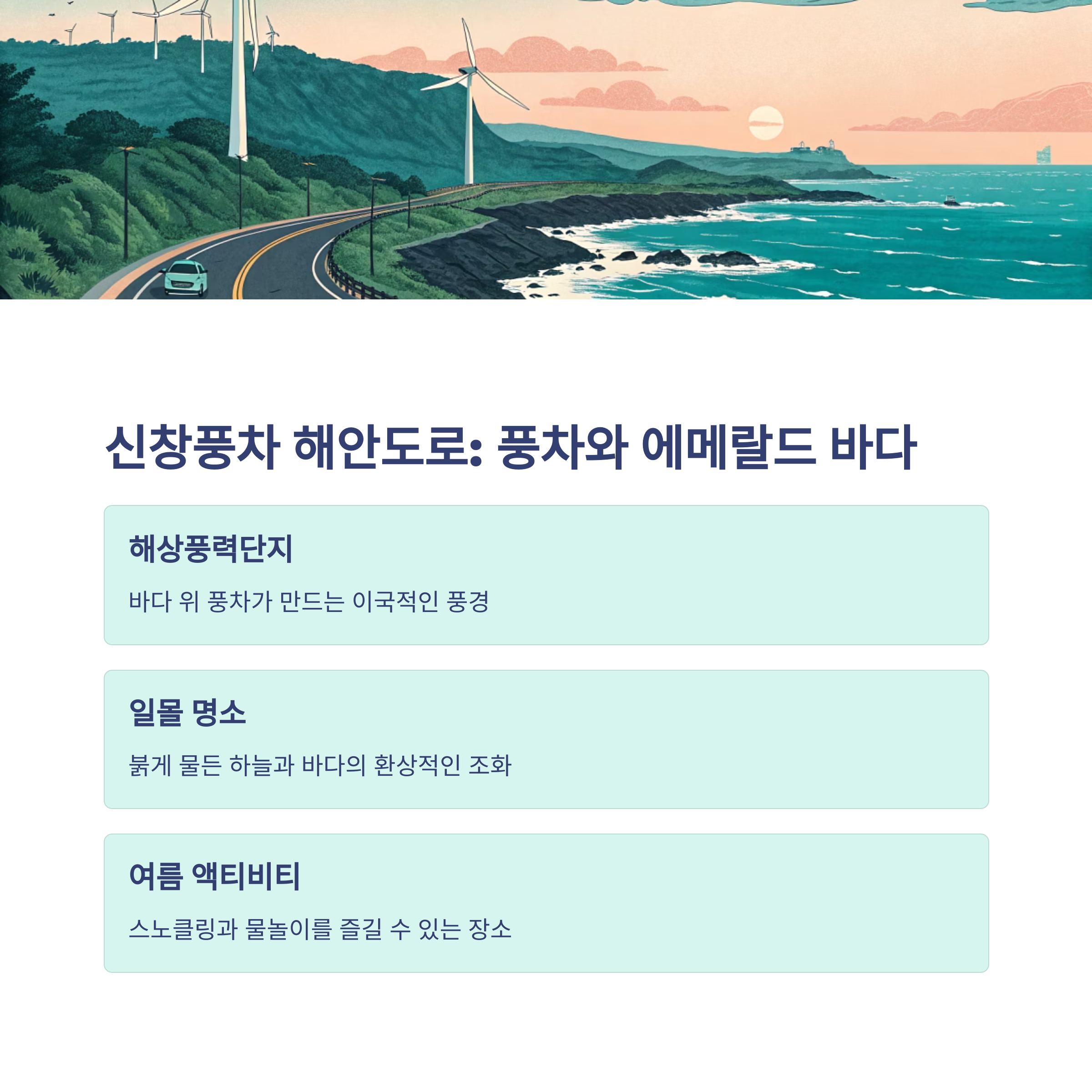 3. 신창풍차 해안도로: 풍차와 노을이 어우러진 서쪽 드라이브 명소