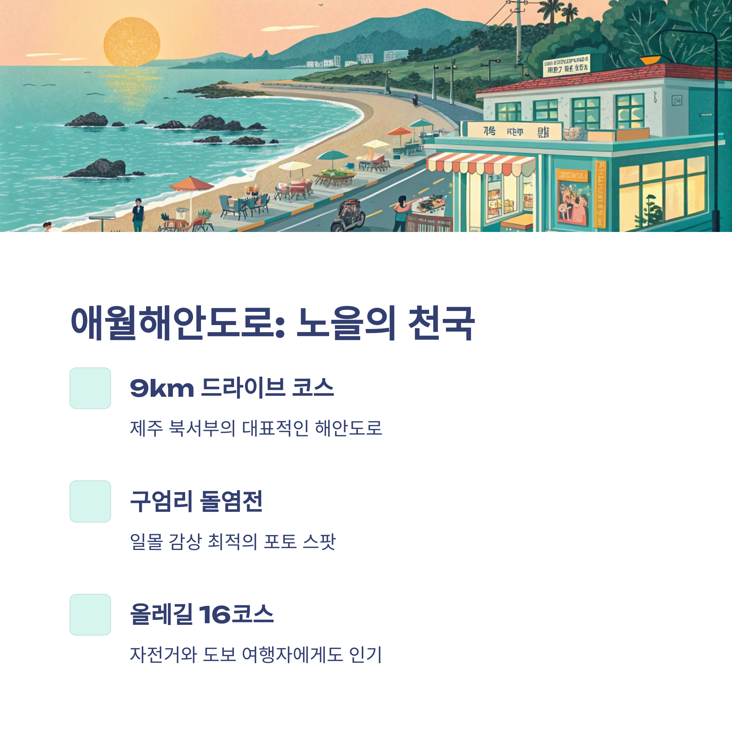 제주시 애월읍을 따라 이어지는 약 9km 길이의 애월해안도로는 제주 북서부의 대표적인 드라이브 코스입니다. 이 도로는 제주 환상 자전거길과 올레길 16코스의 일부로, 드라이브뿐만 아니라 자전거와 도보 여행자들에게도 인기가 높습니다. 특히 구엄리 돌염전에서 바라보는 일몰은 많은 이들에게 사랑받는 포토 스폿입니다.