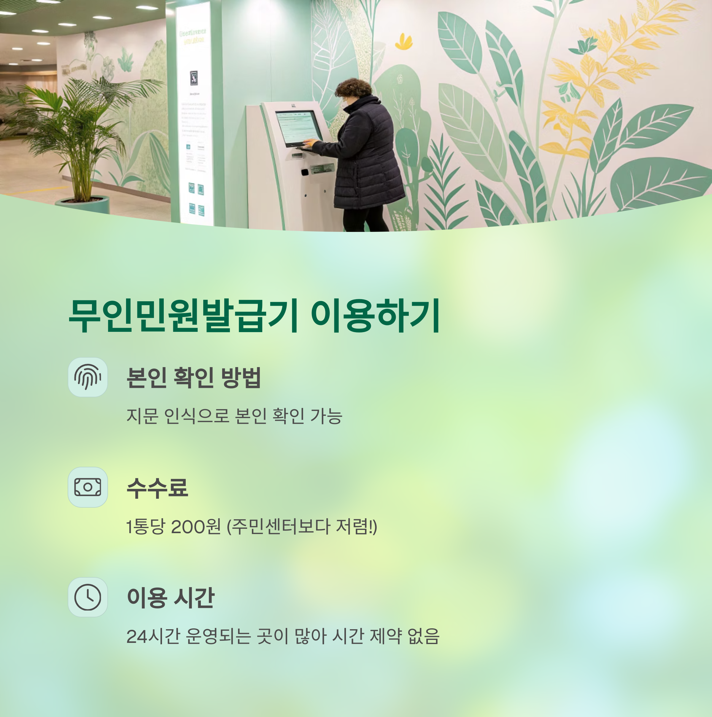 [💡 TIP] 무인민원발급기는 주민센터 외에도 지하철역, 대형마트, 병원 등 다양한 곳에 설치되어 있습니다. 미리 위치를 확인하고 방문하시면 시간을 절약할 수 있습니다.