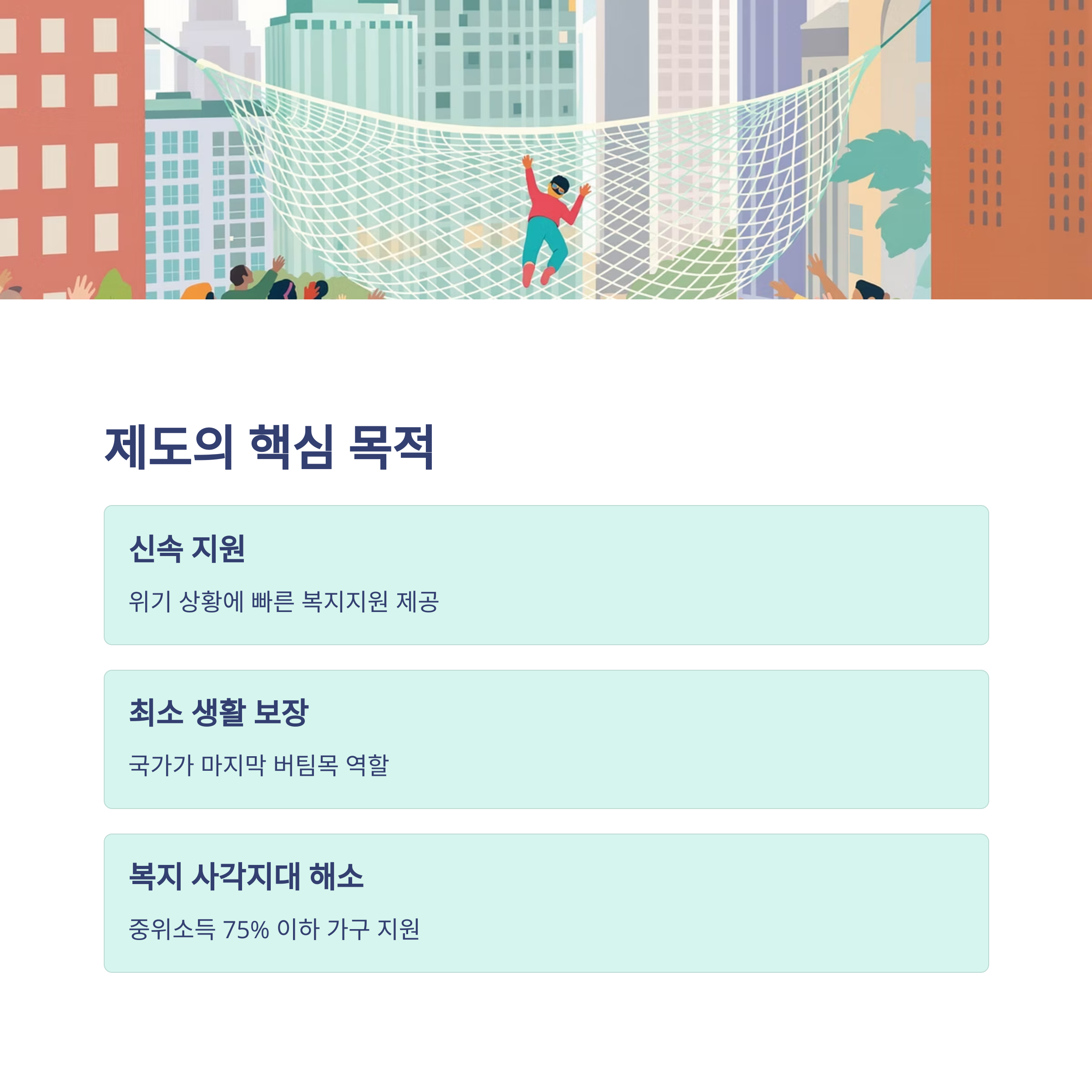 최소한의 생활을 유지할 수 있도록 신속하게 복지지원을 제공하는 것이 목적입니다.
