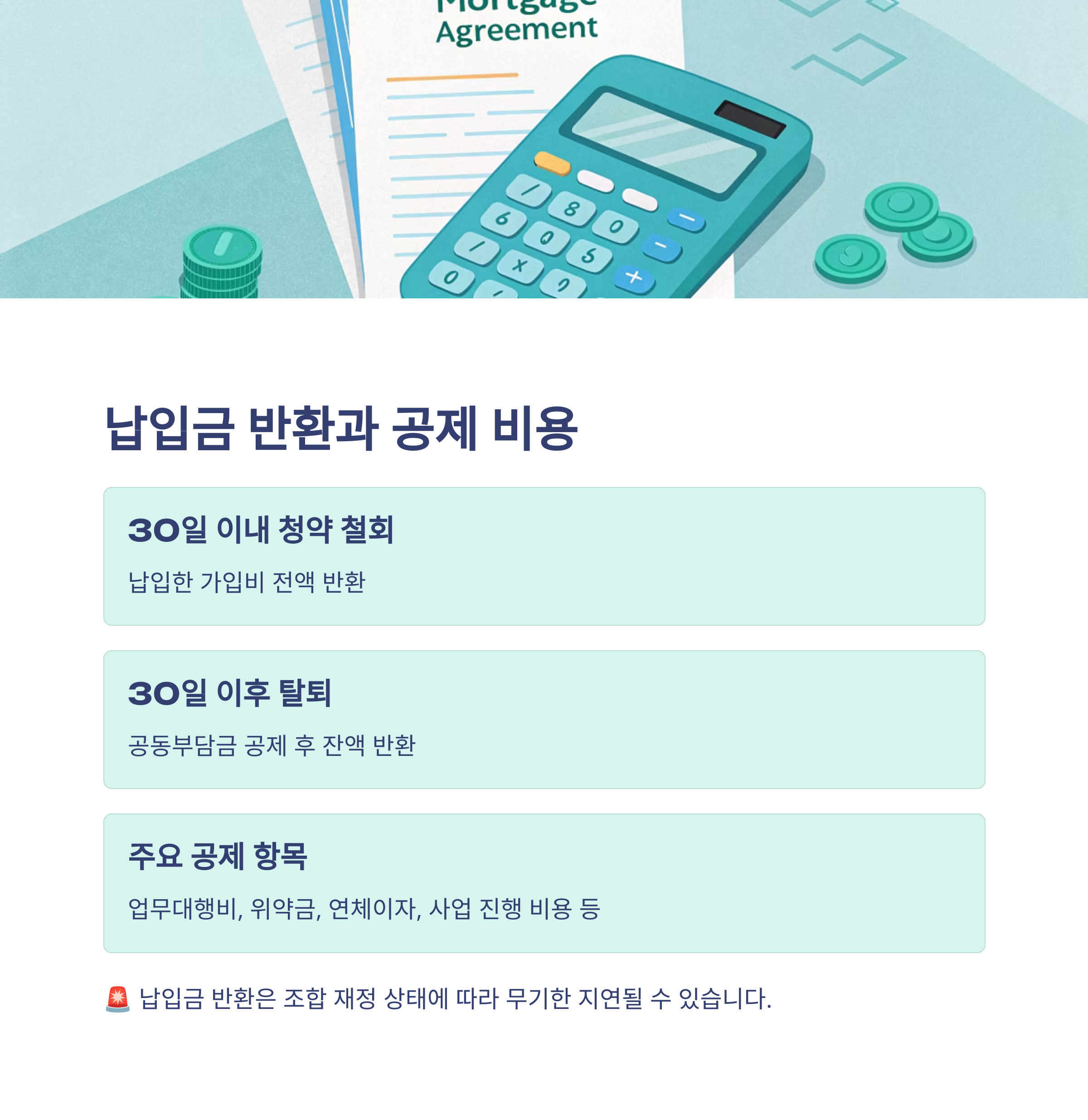 • 30일 이후 탈퇴: 납입한 조합분담금에서 소정의 공동부담금을 공제한 잔액이 반환됩니다.