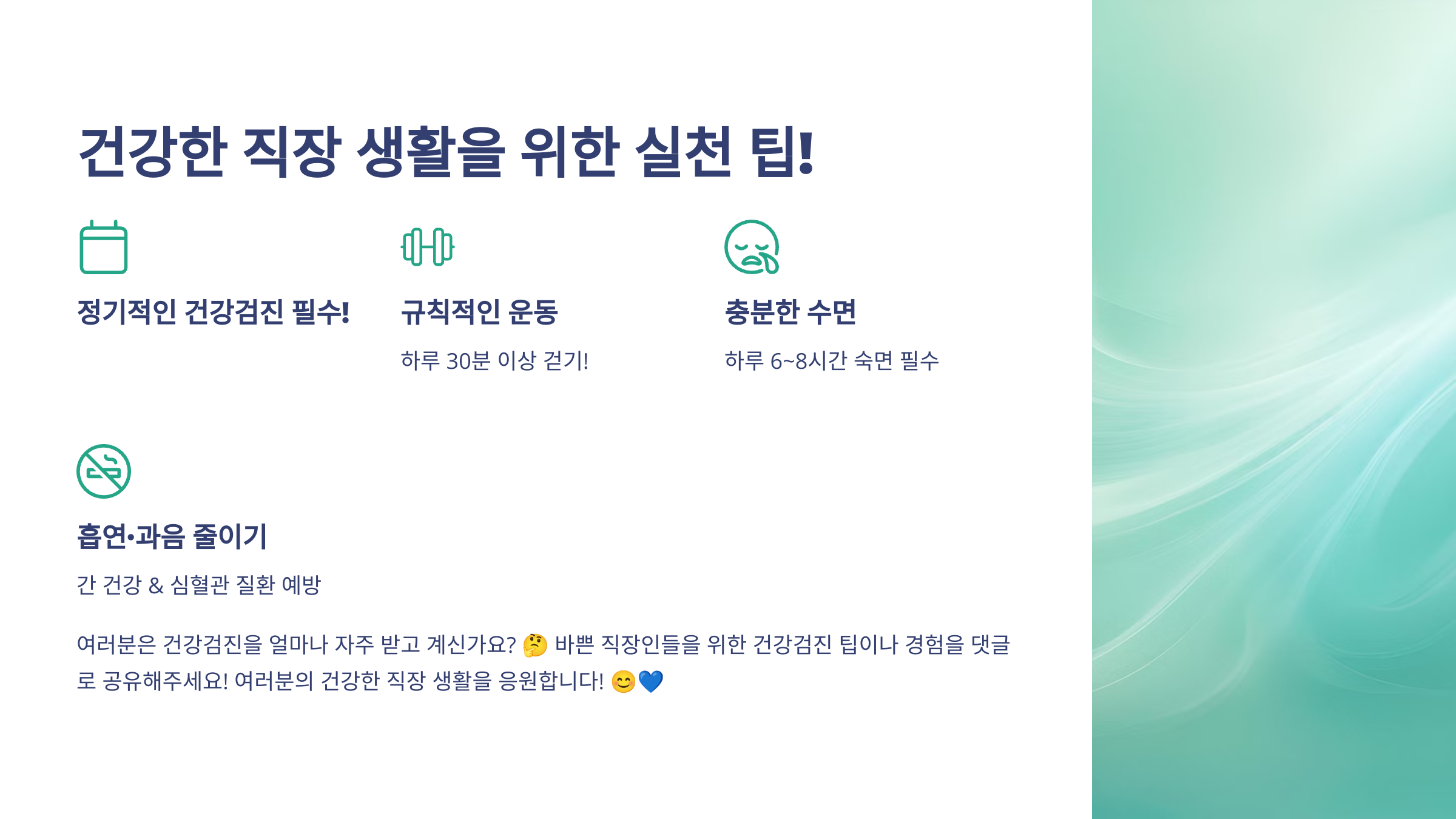 ✅ 흡연·과음 줄이기 (간 건강 & 심혈관 질환 예방)
