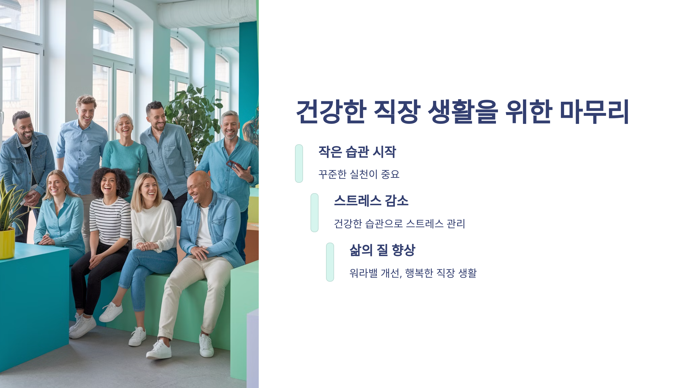 건강한 직장 생활을 위해 작은 습관부터 시작해 보세요. 꾸준히 실천하면 스트레스는 줄고, 삶의 질은 높아질 거예요! 다음에도 더 좋은 팁으로 찾아올게요. ✨