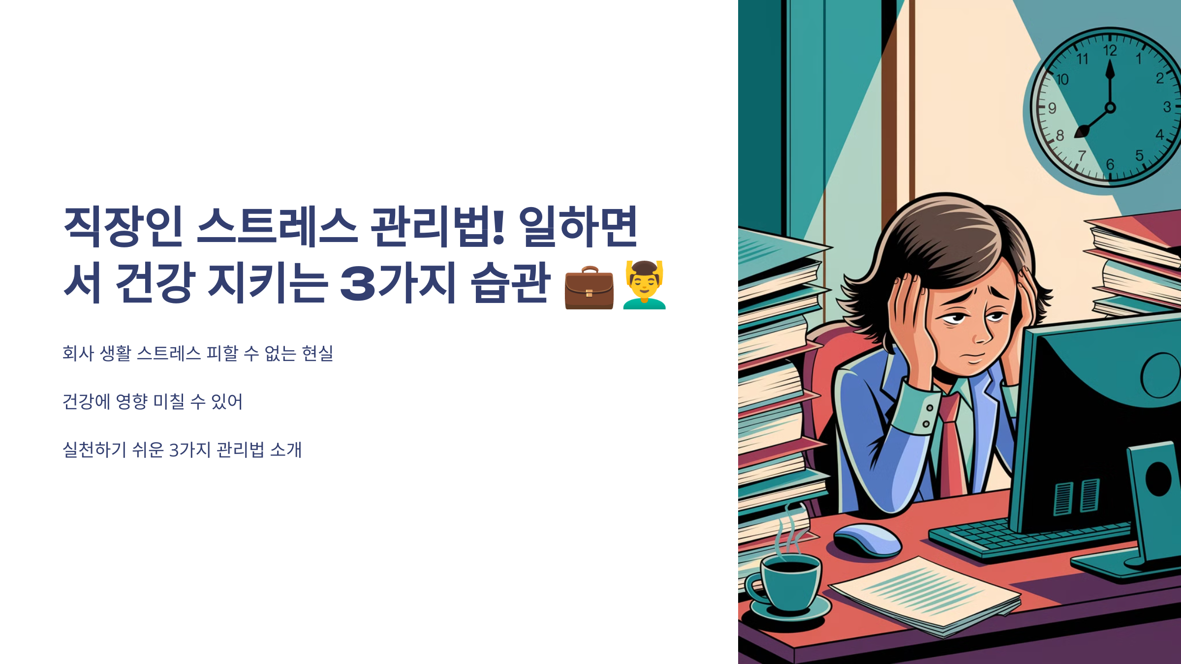 회사 생활을 하다 보면 스트레스는 피할 수 없는 현실이에요. 하지만 스트레스를 제대로 관리하지 않으면 건강에도 영향을 미칠 수 있죠. 그렇다면 어떻게 하면 직장 생활을 하면서도 건강을 지킬 수 있을까요? 오늘은 실천하기 쉬운 직장인 스트레스 관리법 3가지를 알려드릴게요! 😊