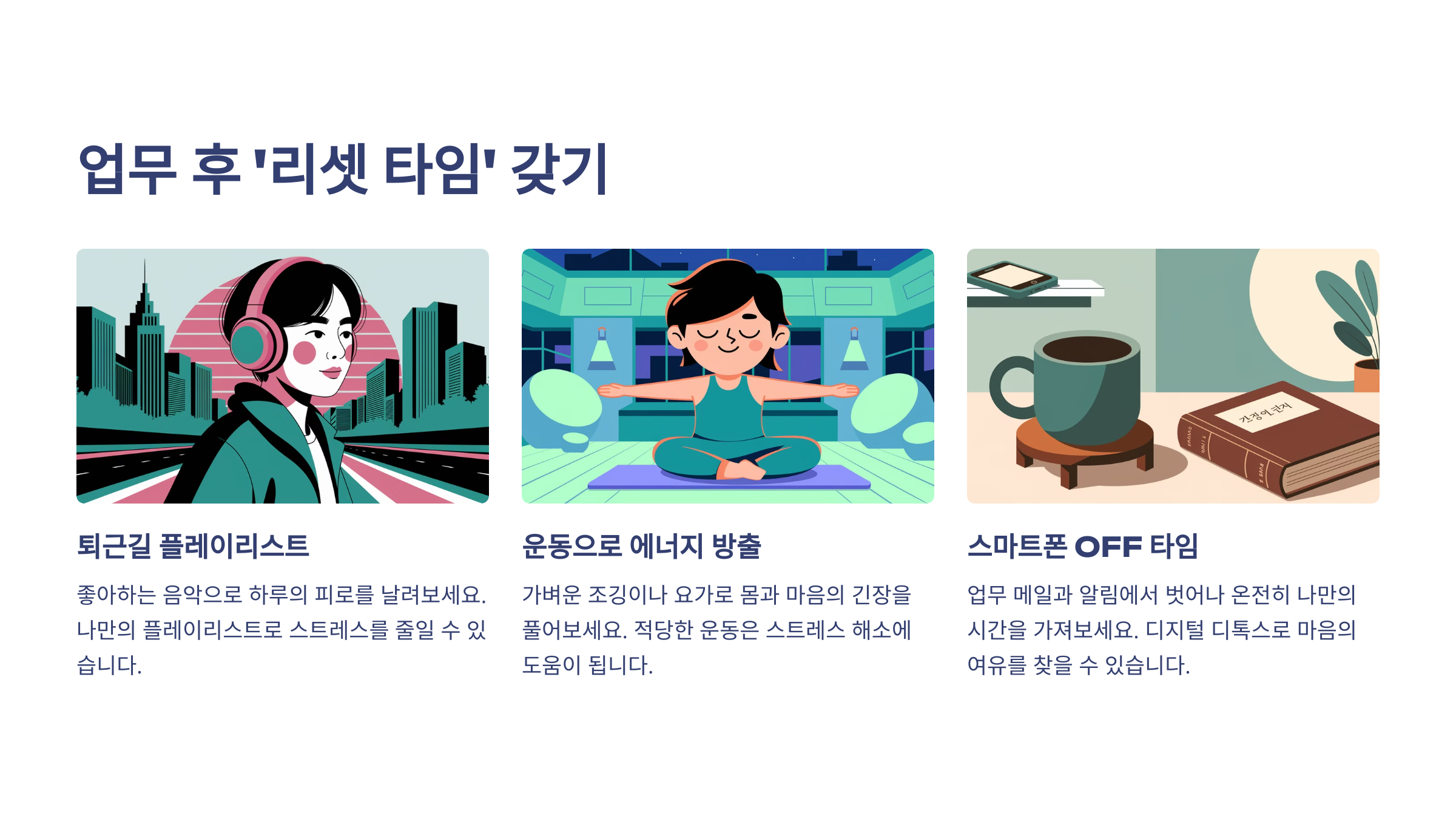 작은 변화지만, 퇴근 후 시간을 잘 활용하면 업무 스트레스에서 훨씬 자유로워질 수 있어요! 🎵🏃♀️