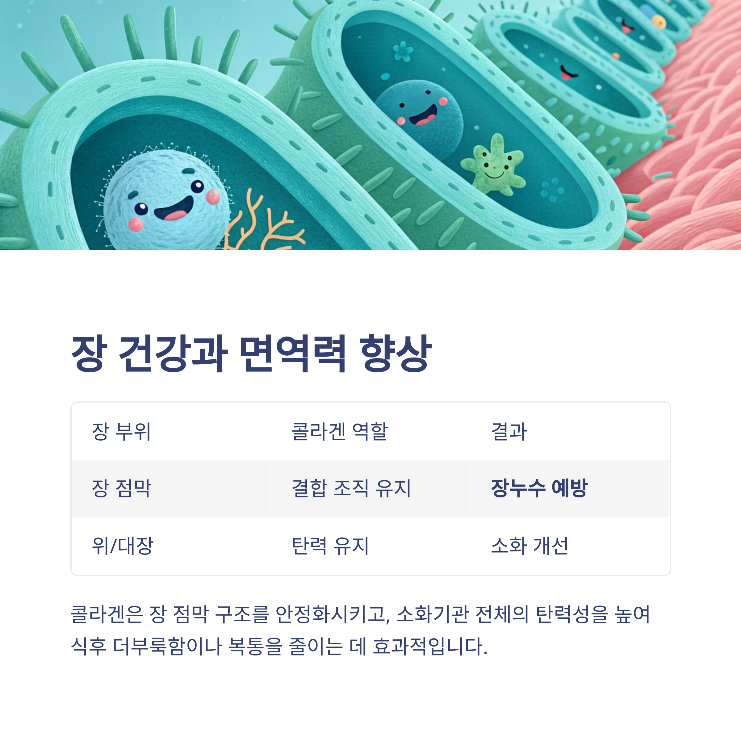 콜라겐은 장점막 구조를 안정화시키고, 장누수증후군 예방에 기여합니다