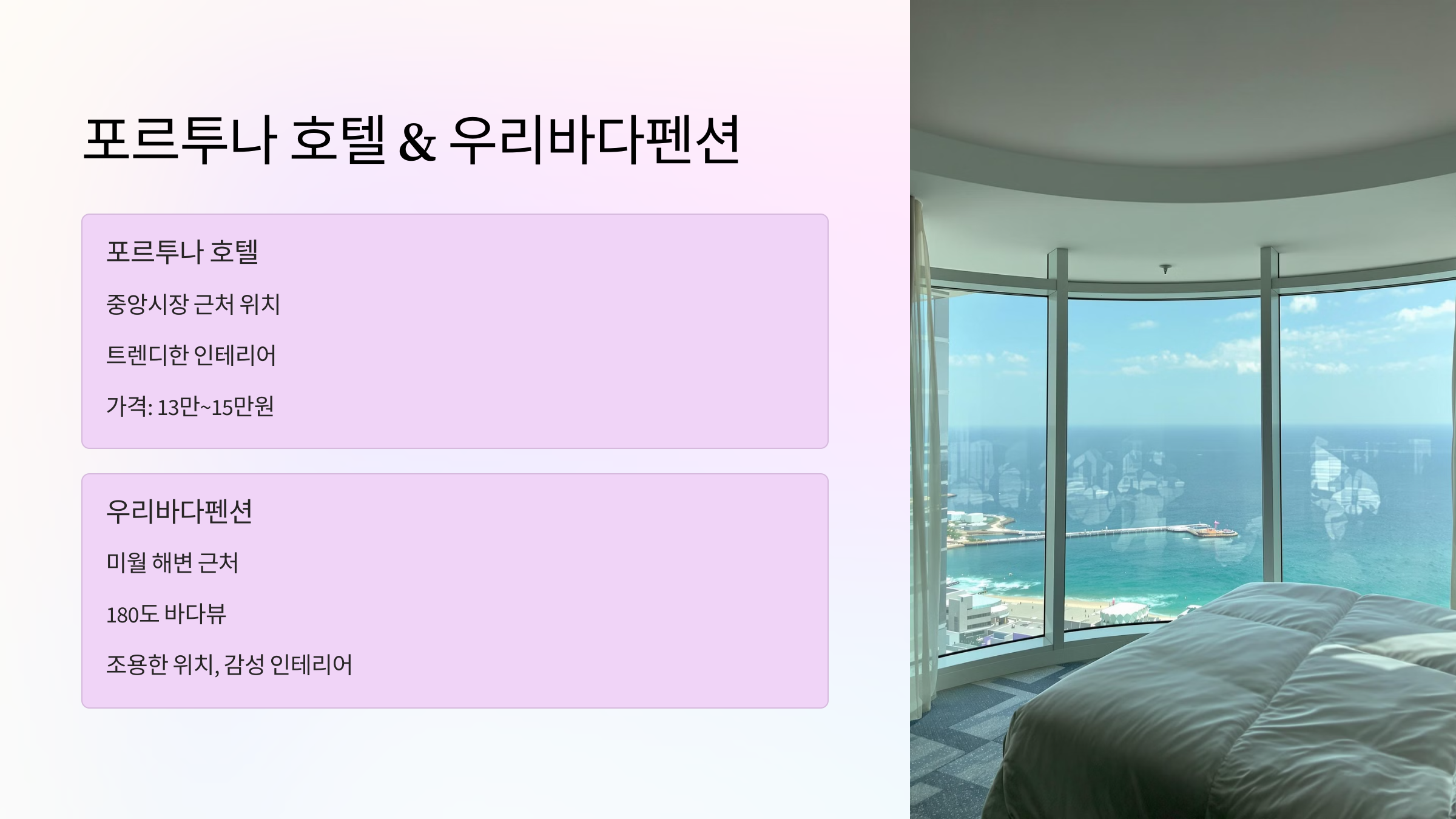 모든 객실이 오션뷰인 숙소도 있지만, 일부 객실만 해당되는 곳도 있으니 예약 시 객실 유형을 꼭 확인하세요.