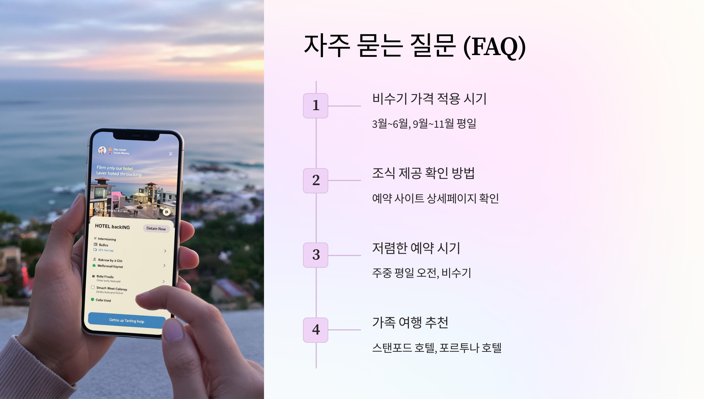 숙소 예약 사이트 상세 페이지 또는 공식 홈페이지에서 ‘조식 포함’ 여부를 꼭 확인해 주세요.