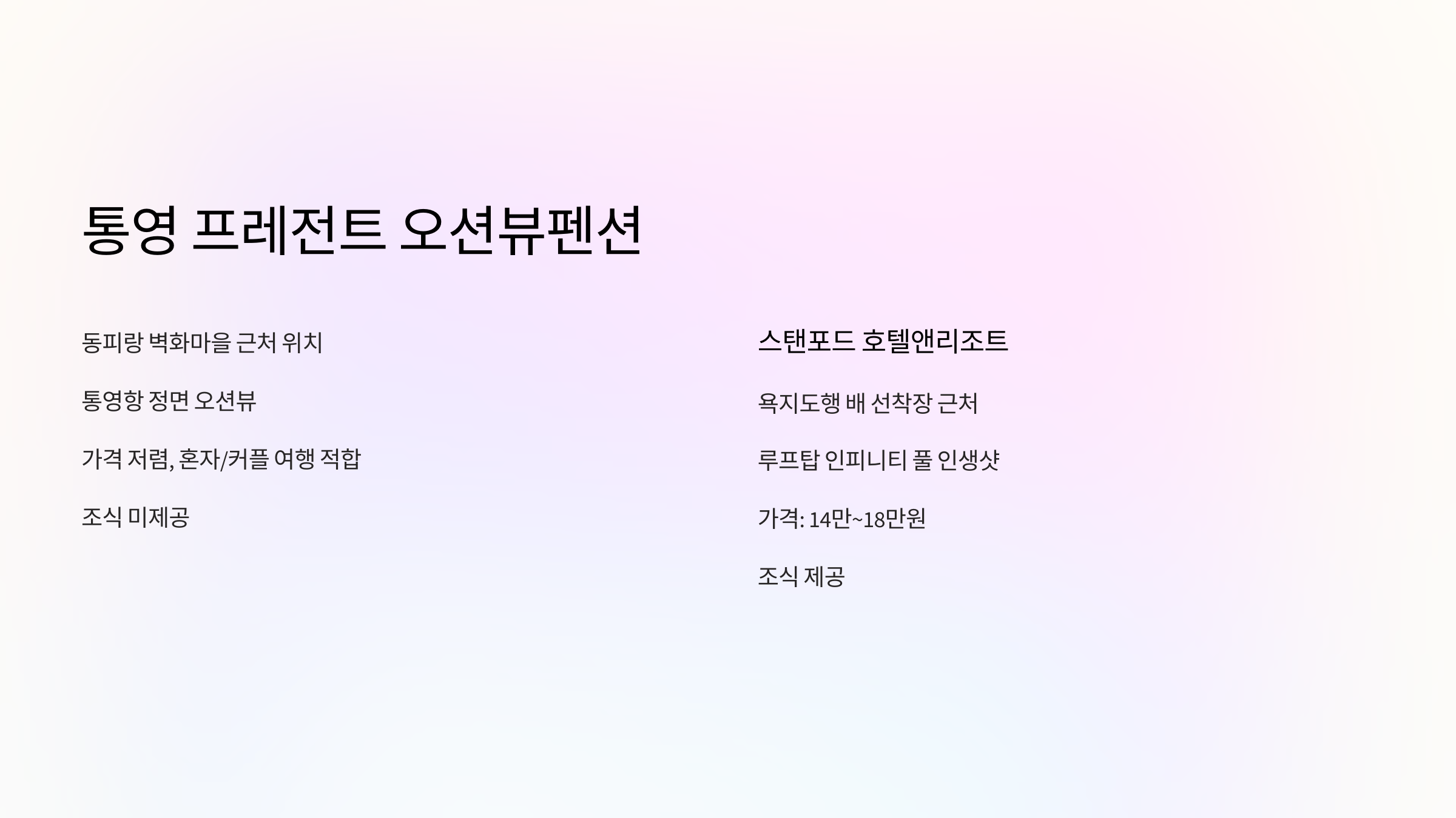 특히나 요즘 같은 때엔 뷰 하나만으로도 마음이 꽉 찬 기분이 드니까요. 그래서 오늘은 제가 직접 정리해 본 통영 오션뷰 숙소 BEST 5를 소개할게요. 각 숙소의 위치, 가격, 후기까지 꽉 채워 담았으니 기대하셔도 좋아요!