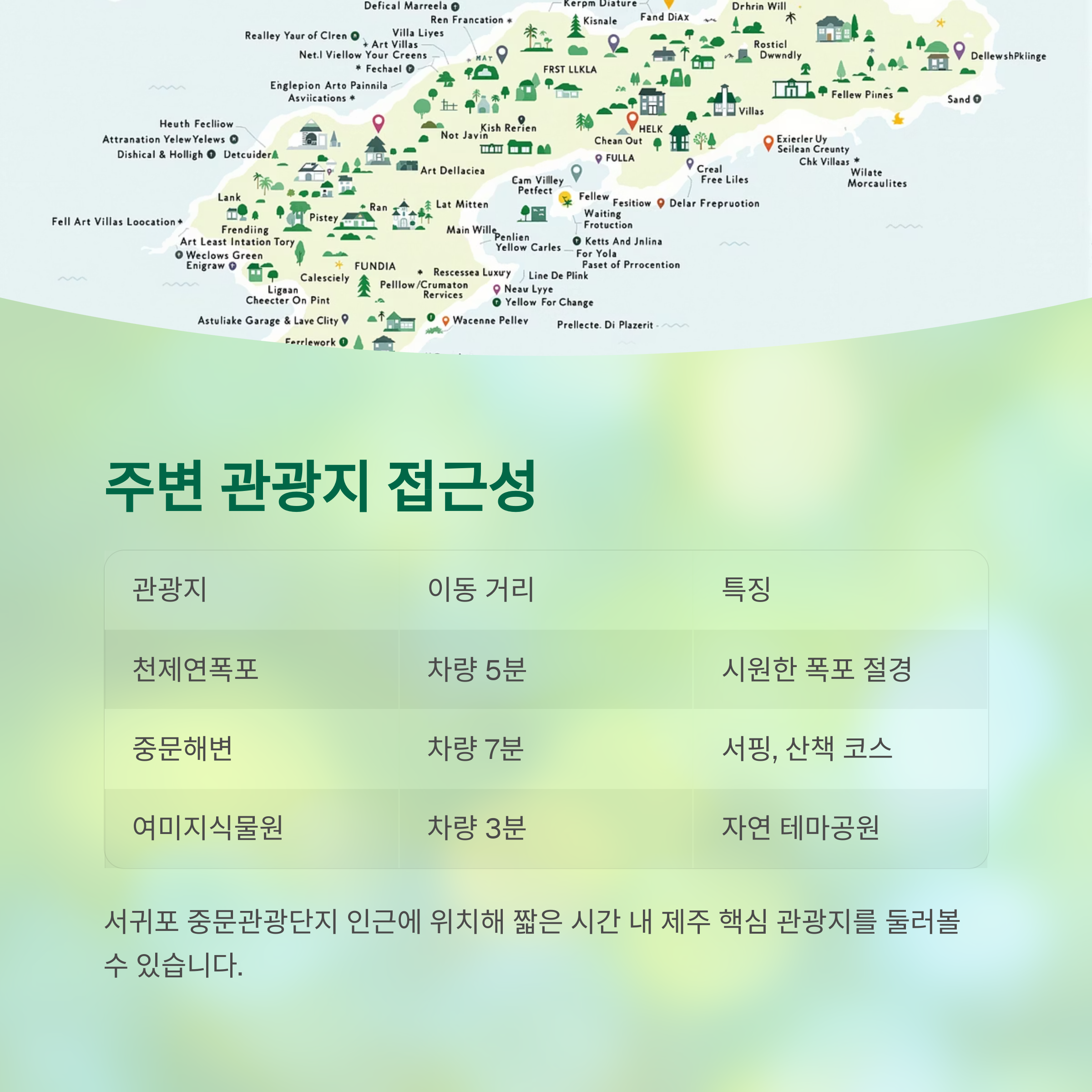 천제연폭포, 주상절리, 중문색달해변 등 주요 관광지와 가깝습니다.