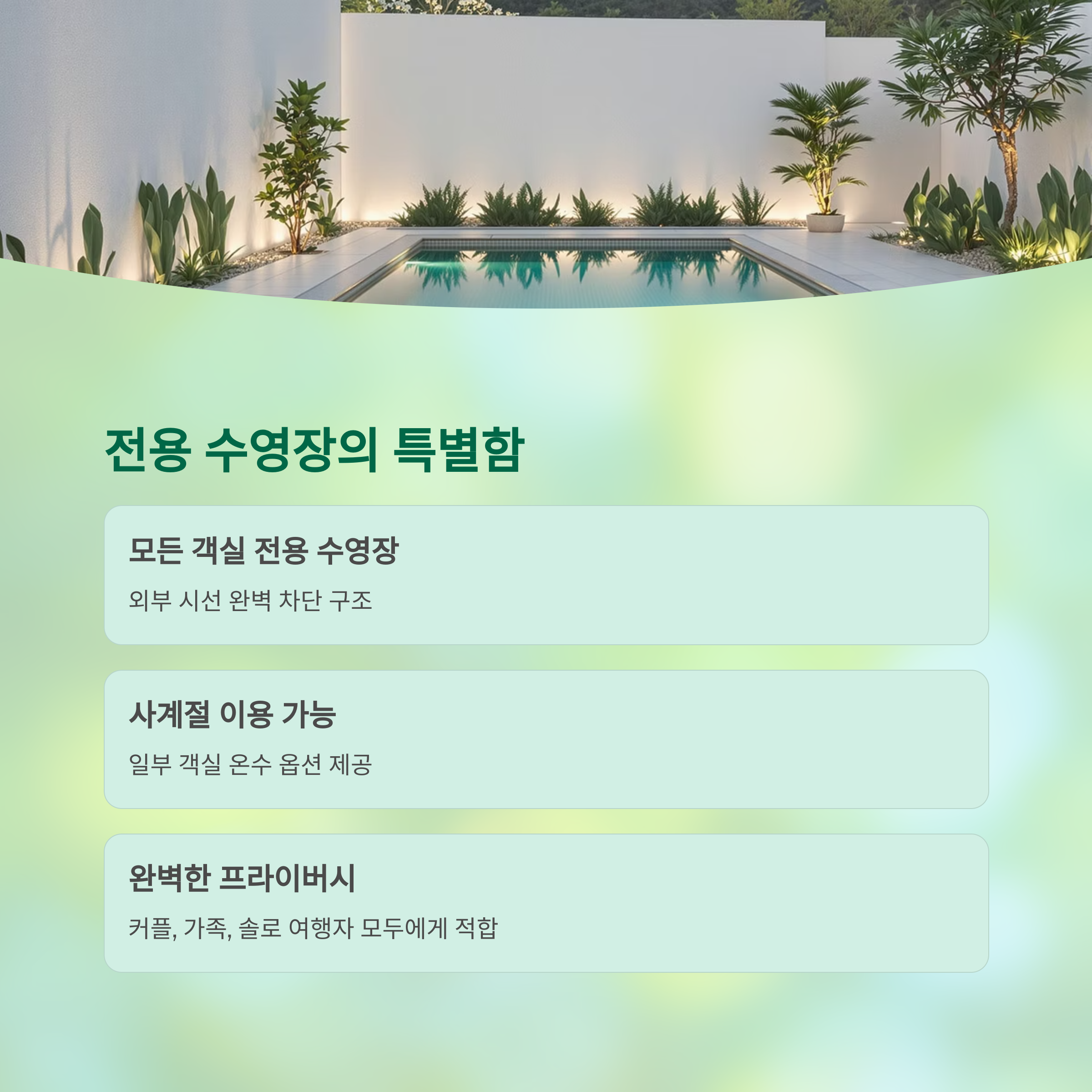 제주 여행에서 사생활이 보장되는 숙소를 원하신다면, 프라이빗 풀 빌라는 최고의 선택입니다.
