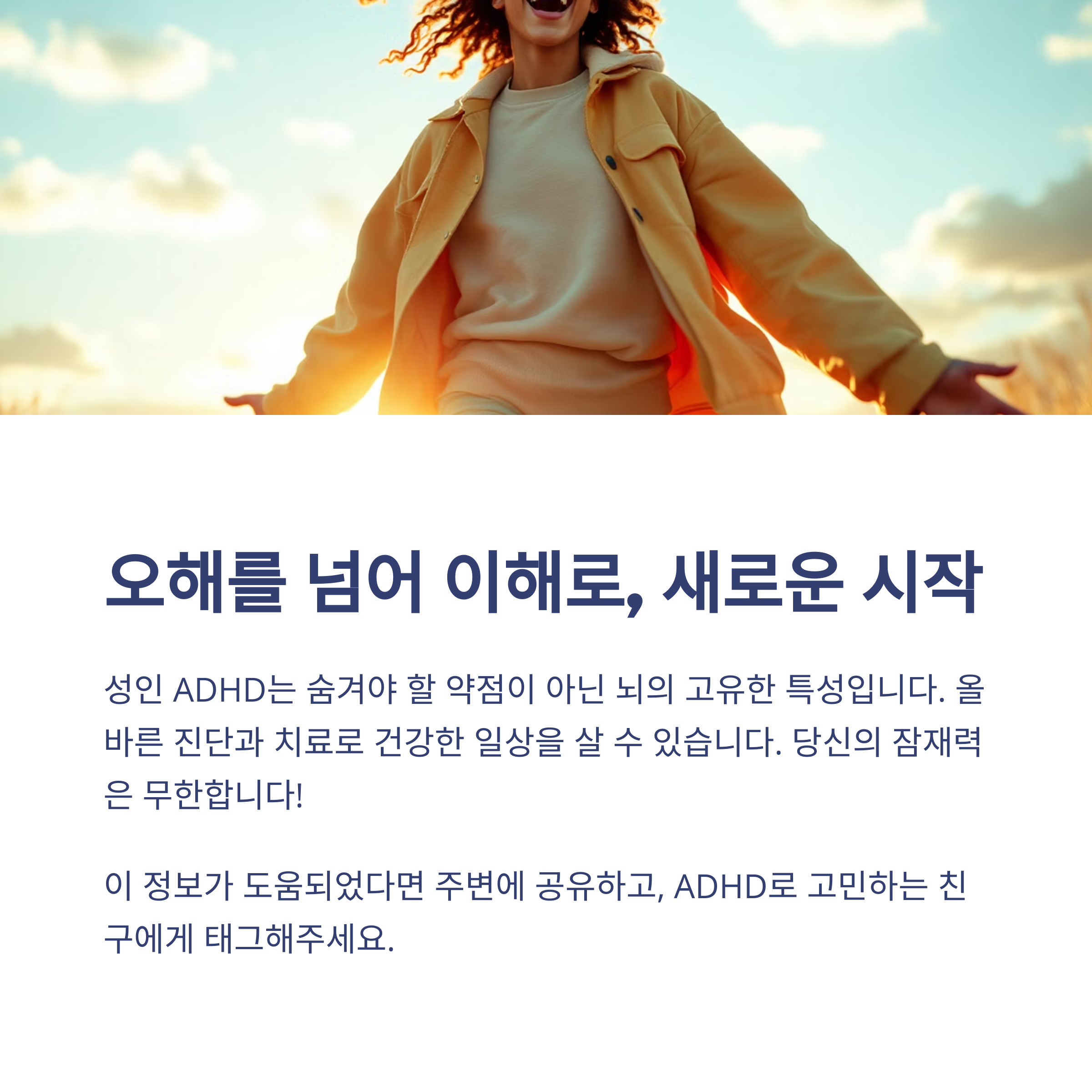 당신의 잠재력은 무한합니다. ADHD는 그 잠재력을 발휘하는 '방법'이 조금 다른 것뿐입니다. 당신의 새로운 시작을 진심으로 응원합니다.