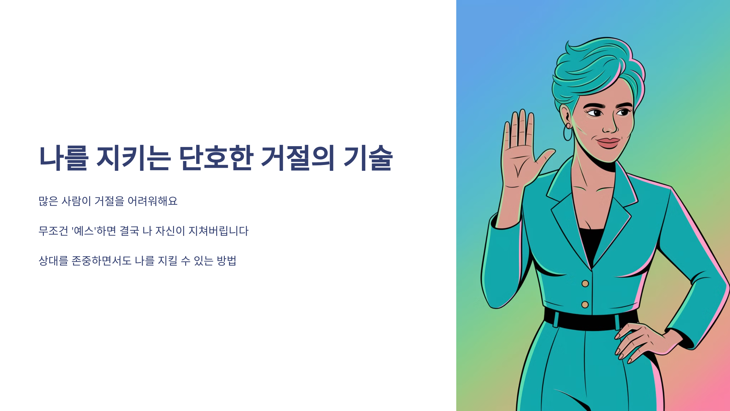 이제부터는 불필요한 '예스' 대신, 필요한 '노'를 할 수 있는 사람이 되어보세요! 💪
